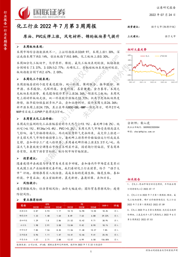 化工行业2022年7月第3周周报:原油、PVC反弹上涨,风电材料、锦纶板块景气提升