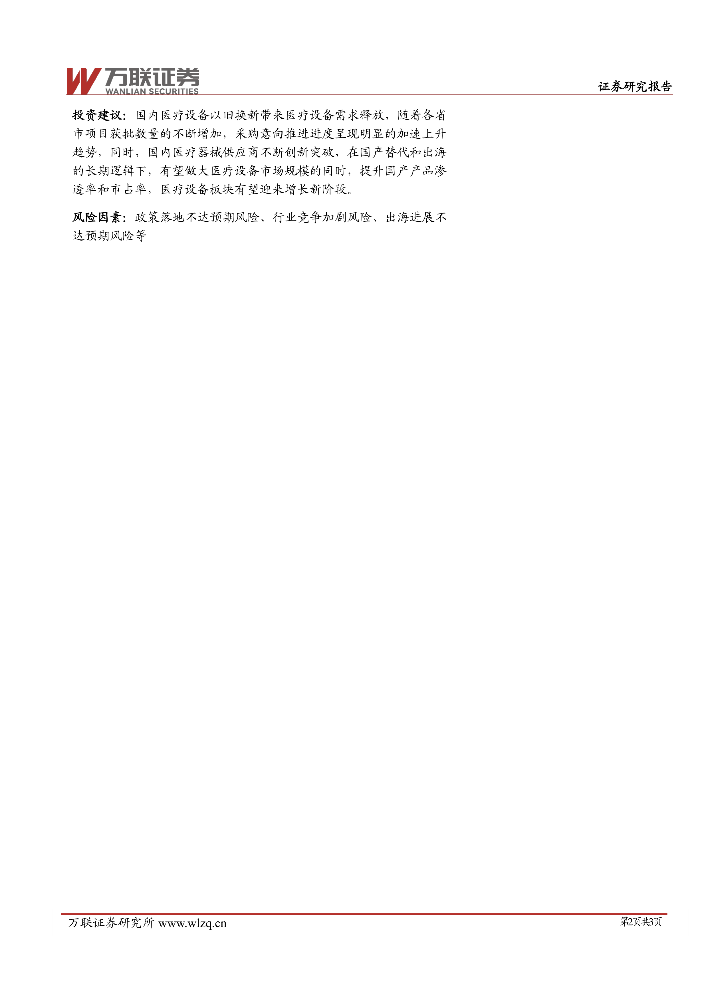 本报告基于公开数据和政策文件,对国家政策推动下医疗设备更新的现状和未来发展趋势进行了深入分析。报告指出,国家政策的大力支持和资金保障,推动了医疗设备更新项目的快速推进,为医疗器械行业带来了显著的增长机遇。 虽然存在一些潜在的风险因素,但总体而言,医疗器械行业在未来一段时间内仍将保持强劲的增长势头。 报告建议投资者关注该行业的发展,并积极把握投资机会。 然而,投资者仍需谨慎评估风险,并根据自身情况做出投资决策。