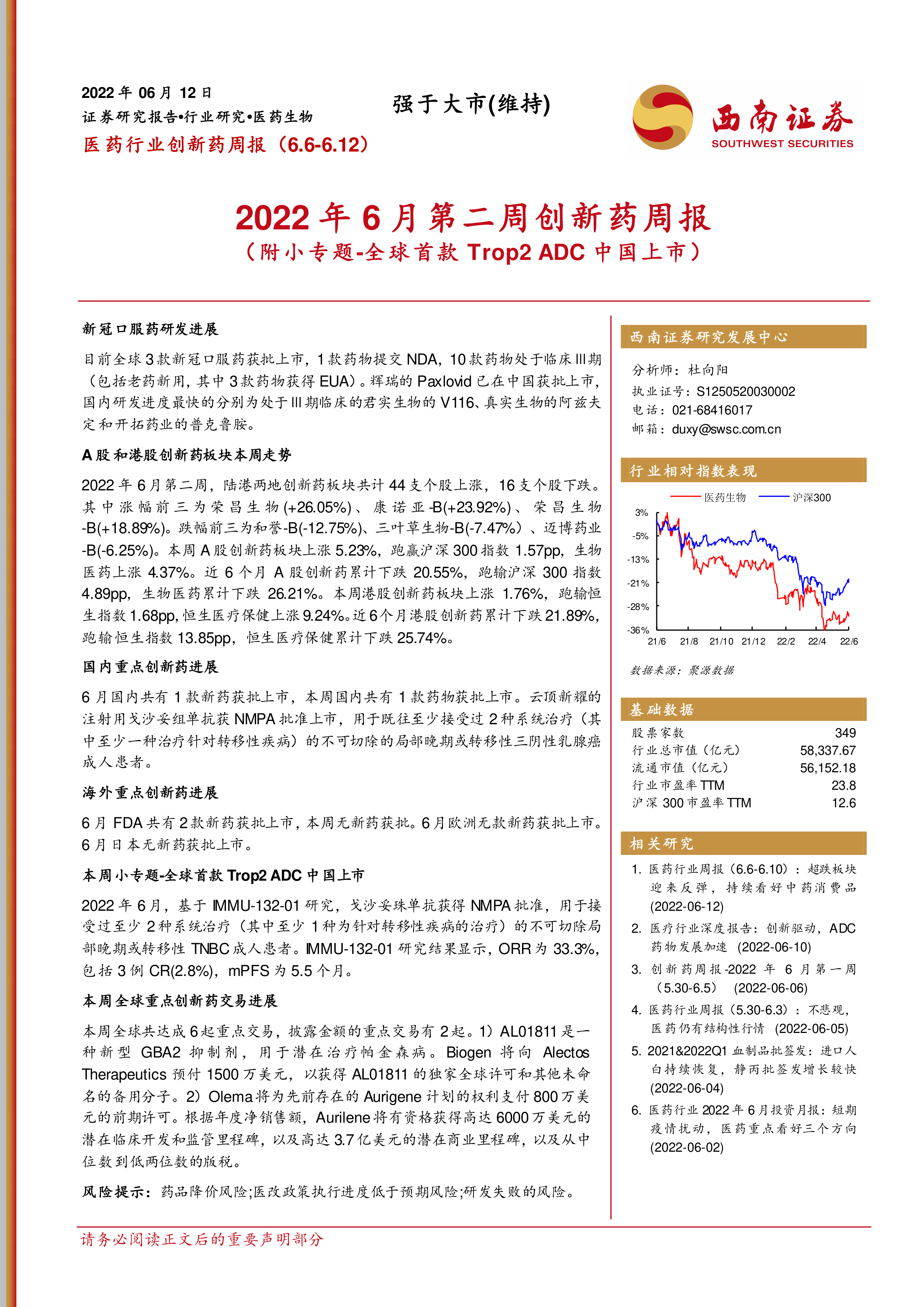 2022年6月第二周创新药周报(附小专题-全球首款Trop2 ADC中国上市)
