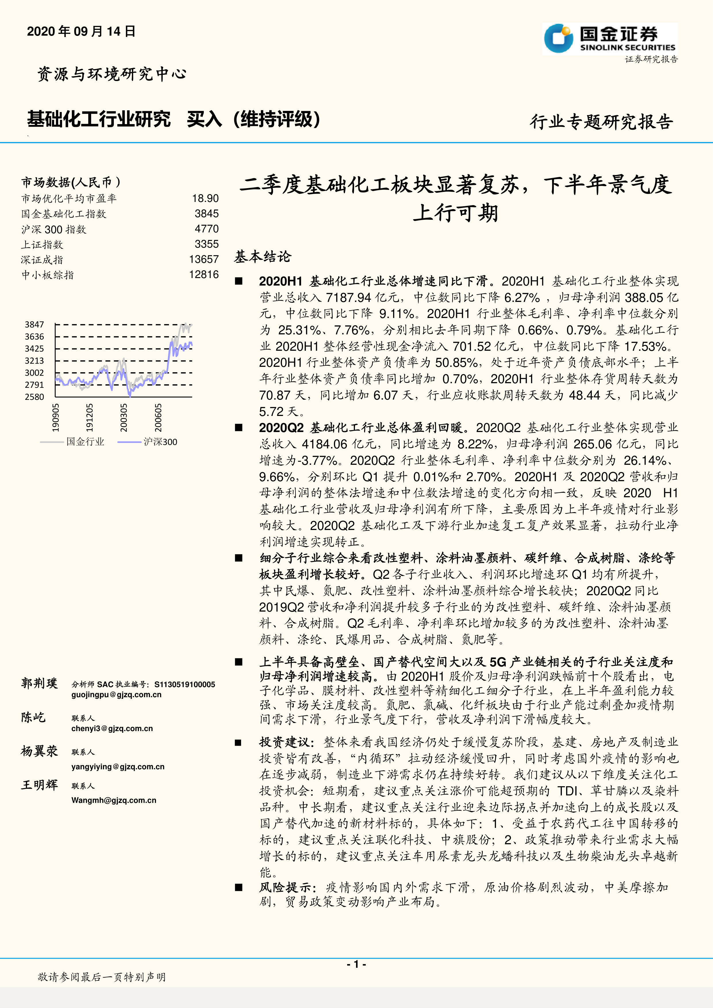 本报告的核心观点是:2020年上半年,基础化工行业整体增速同比下滑,主要受疫情影响;但2020年二季度行业盈利显著回暖,下半年景气度有望持续上行。 具体而言,报告分析了行业整体财务状况、细分子行业表现,并针对部分子行业进行了深入分析,最终给出投资建议和风险提示。