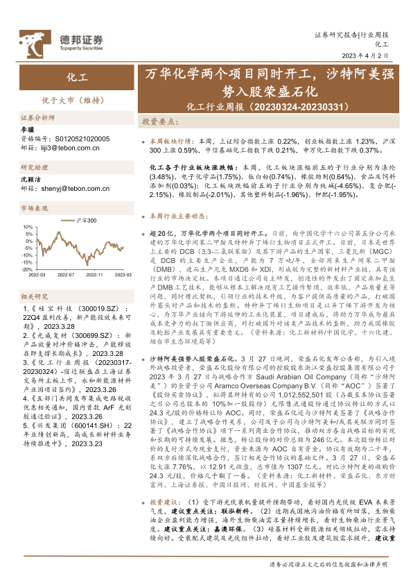 化工行业周报:万华化学两个项目同时开工,沙特阿美强势入股荣盛石化
