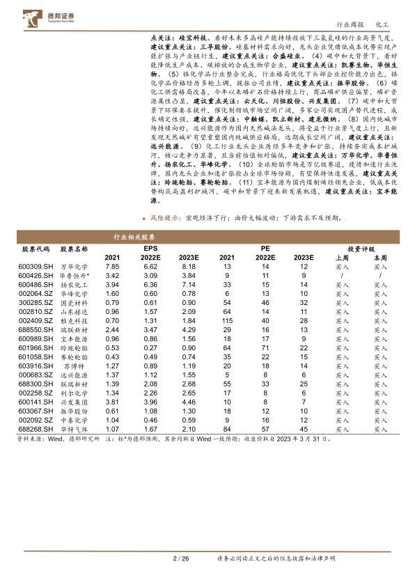 投资建议:(1)受下游光伏装机量提升预期带动,看好国内光伏级EVA未来景气度,建议重点关注:联泓新科。(2)近期我国地沟油价格有所回落,生物柴油企业盈利能力增强,海外生物柴油需求量持续增长,看好生物柴油行业景气度。建议重点关注:嘉澳环保。(3)硅基材料受新能源相关领域拉动,需求持续向好。受装配式建筑及光伏组件拉动,看好工业胶及建筑胶需求提升,建议重点关注:硅宝科技。看好未来多晶硅产能持续投放下三氯氢硅的行业高景气度,建议重点关注:三孚股份。硅基材料需求向好,龙头企业凭借低成本优势实现产能扩张与产业链衍生,建议重点关注:合盛硅业。(4)碳中和大背景下,看好能降低生产成本、碳排放的合成生物学企业,建议重点关注:凯赛生物、华恒生物。(5)铬化学品行业整合完成,行业格局优化下头部企业控价能力出色,铬化学品价格经历多轮上调,提振公司业绩,建议重点关注:振华股份。(6)磷化工供需格局改善,今年以来磷矿石价格持续上行,商品磷矿供应偏紧,磷矿资源属性凸显,建议重点关注:云天化、川恒股份、兴发集团。(7)碳中和大背景下环保要求提升,催化剂领域市场空间广阔,多家公司实现国产替代进程,成长确定性强,建议重点关注:中触媒、凯立新材、建龙微纳。(8)国内纯碱市场持续向好,远兴能源作为国内天然碱法龙头,将受益于行业景气度上行,且新发现天然碱矿有望重塑国内纯碱供应格局,远期成长空间广阔,建议重点关注:远兴能源。(9)化工行业龙头企业历经多年竞争和扩张,持续夯实成本护城河,核心竞争力显著,且当前估值相对偏低,建议重点关注:万华化学、华鲁恒升、扬农化工、华峰化学。(10)全球轮胎市场是万亿级赛道,疫情加速行业洗牌,国内龙头企业加速扩张抢占全球市场份额,有望保持快速发展,建议重点关注:玲珑轮胎、赛轮轮胎。(11)宝丰能源为国内煤制烯烃领先企业,低成本优势构筑高盈利护城河,碳中和背景下迎来新发展机遇,建议重点关注:宝丰能源。