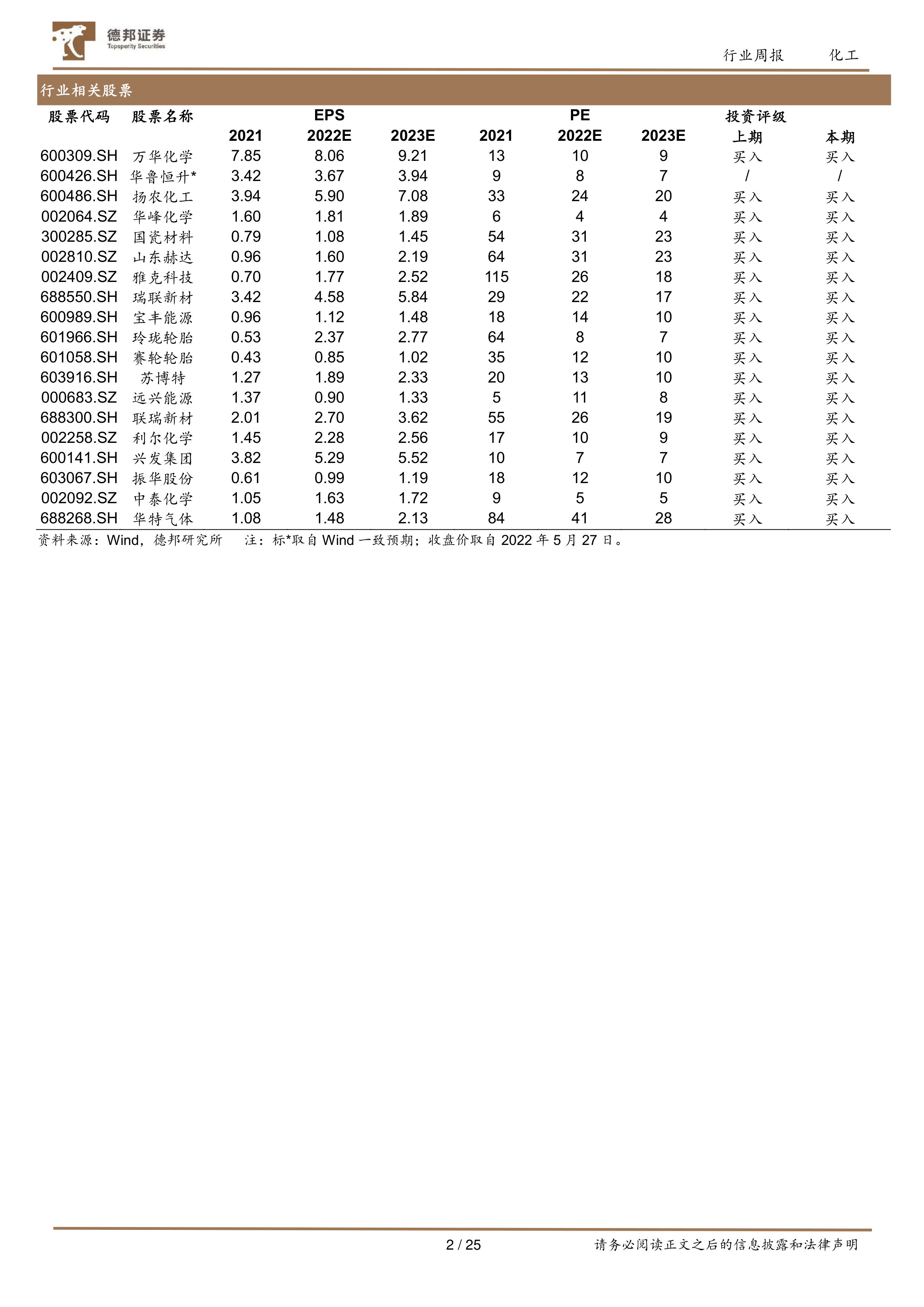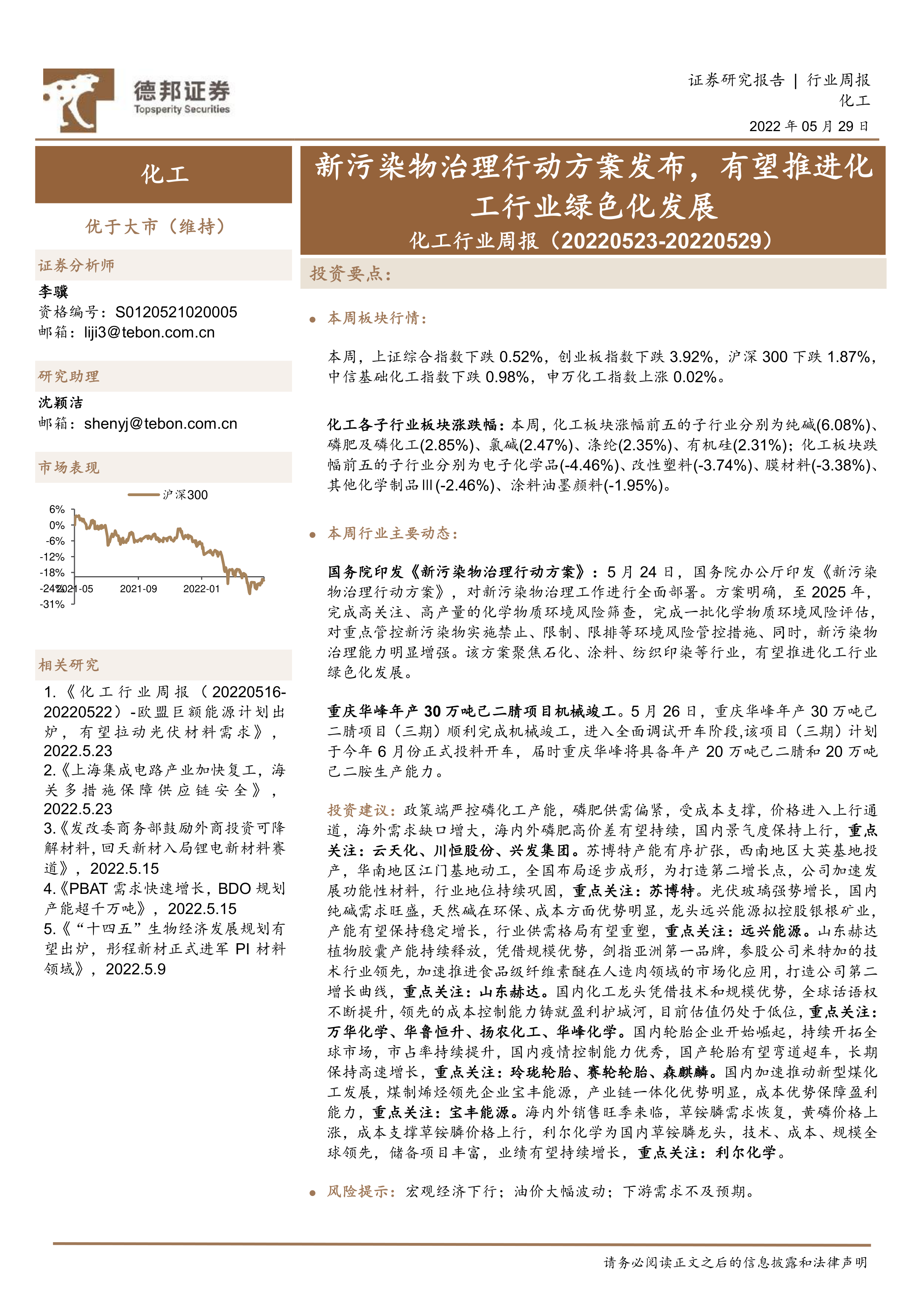本报告涵盖了化工行业周报(2022年5月23日至2022年5月29日)的主要内容,包括市场行情回顾、重要子行业市场回顾以及投资建议等。