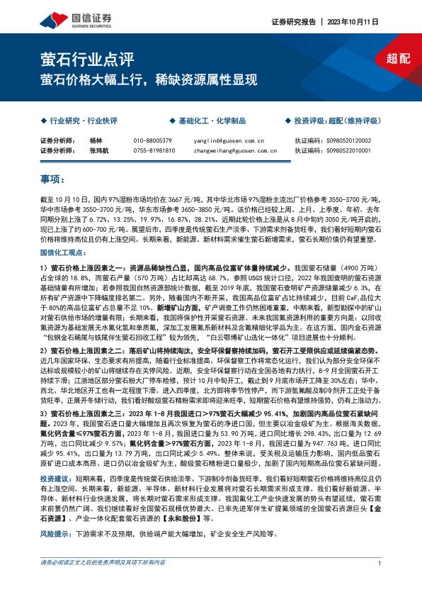投资建议:短期来看,四季度是传统萤石供给淡季、下游制冷剂备货旺季,我们看好短期萤石价格将维持高位且仍有上涨空间。长期来看,新能源、半导体、新材料行业发展将对萤石长期需求形成支撑。我们看好新能源、半导体、新材料行业快速发展,将长期对萤石需求形成支撑。我国氟化工产业快速发展的势头有望延续,萤石需求前景仍然广阔。我们继续看好全国萤石规模优势最大、已率先进军伴生矿提氟领域的全国萤石资源巨头【金石资源】、产业一体化配套萤石资源的【永和股份】等。