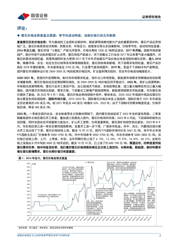 报告首先对2016年至今萤石价格走势进行了复盘,分析了价格波动的历史原因,并结合图表数据,详细阐述了2023年萤石价格上涨的幅度和原因。 报告预测,四季度是萤石传统需求旺季,价格将维持高位并有上涨空间。长期来看,新能源、新材料需求将持续支撑萤石价格。