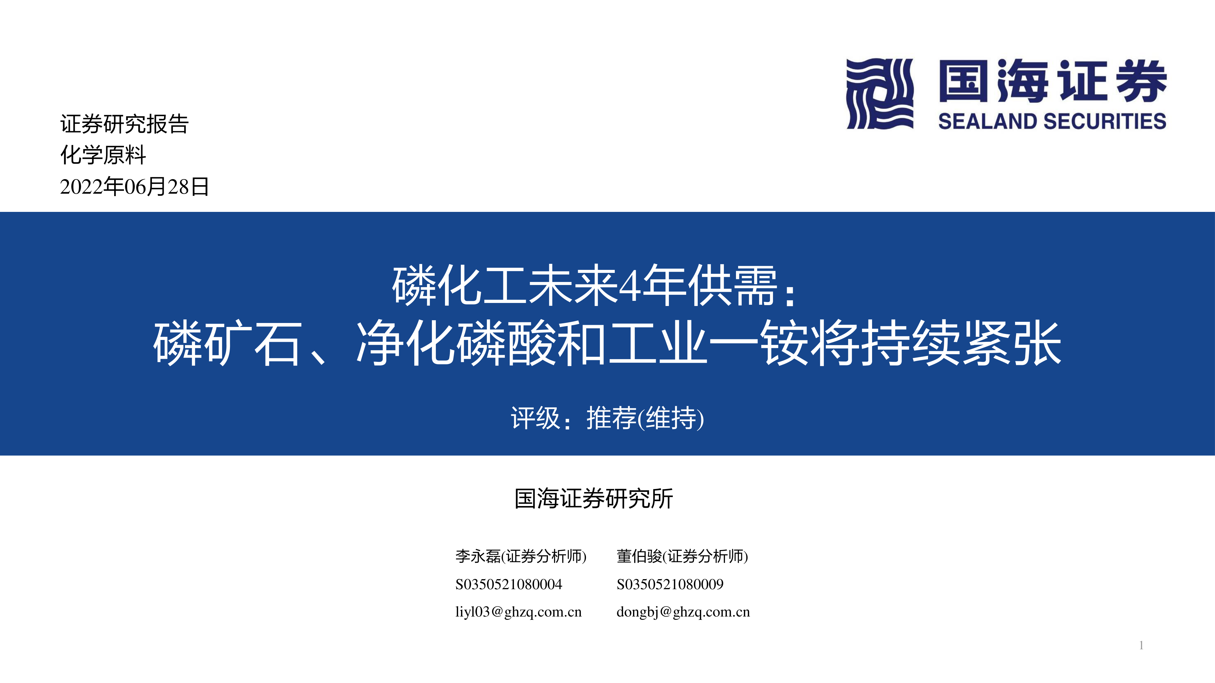考虑到磷矿石、湿法净化磷酸、工业级磷酸一铵供给受限,需求持续增长,行业景气度有望维持,维持磷化工行业“推荐”评级。