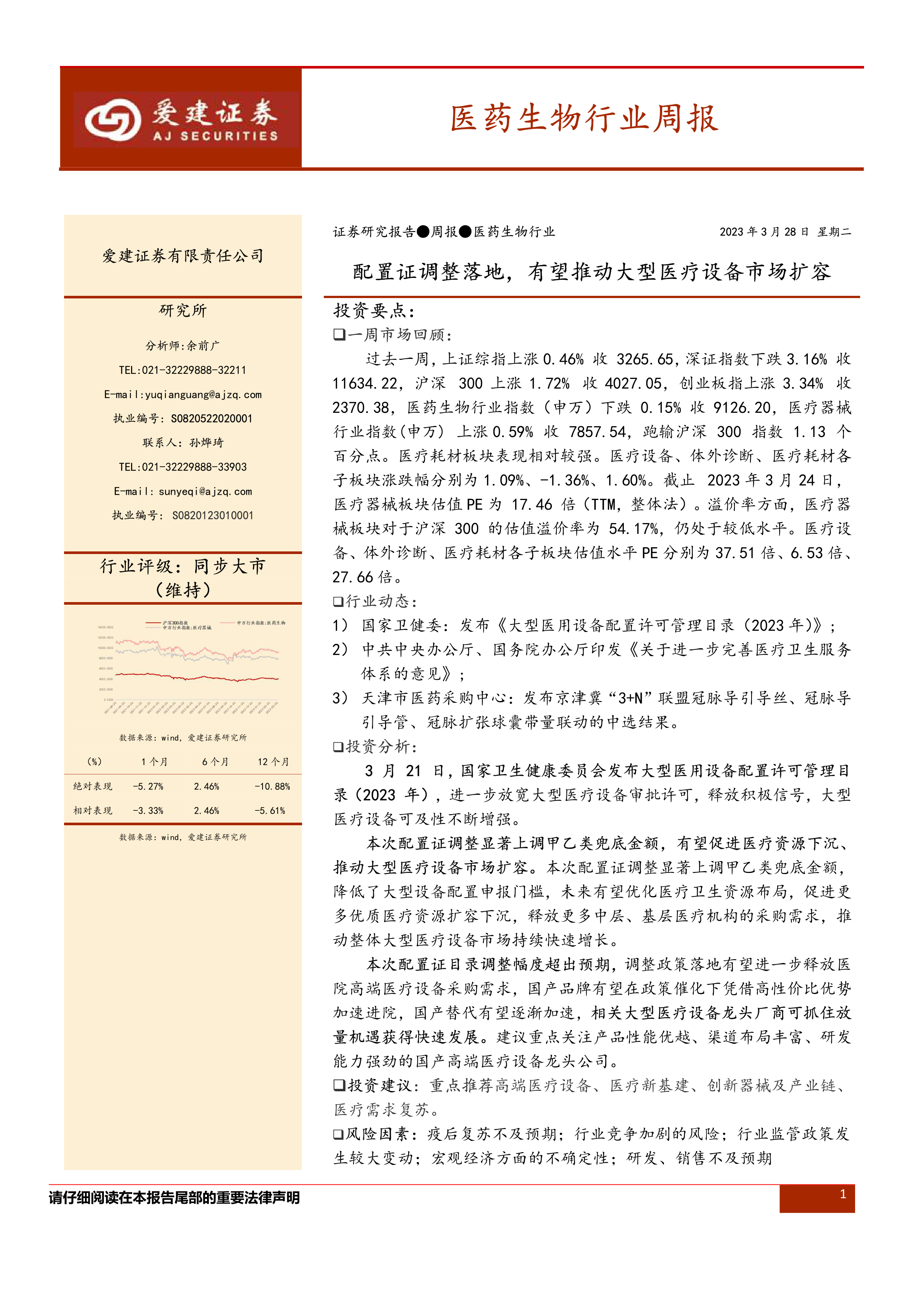 医药生物行业周报:配置证调整落地,有望推动大型医疗设备市场扩容