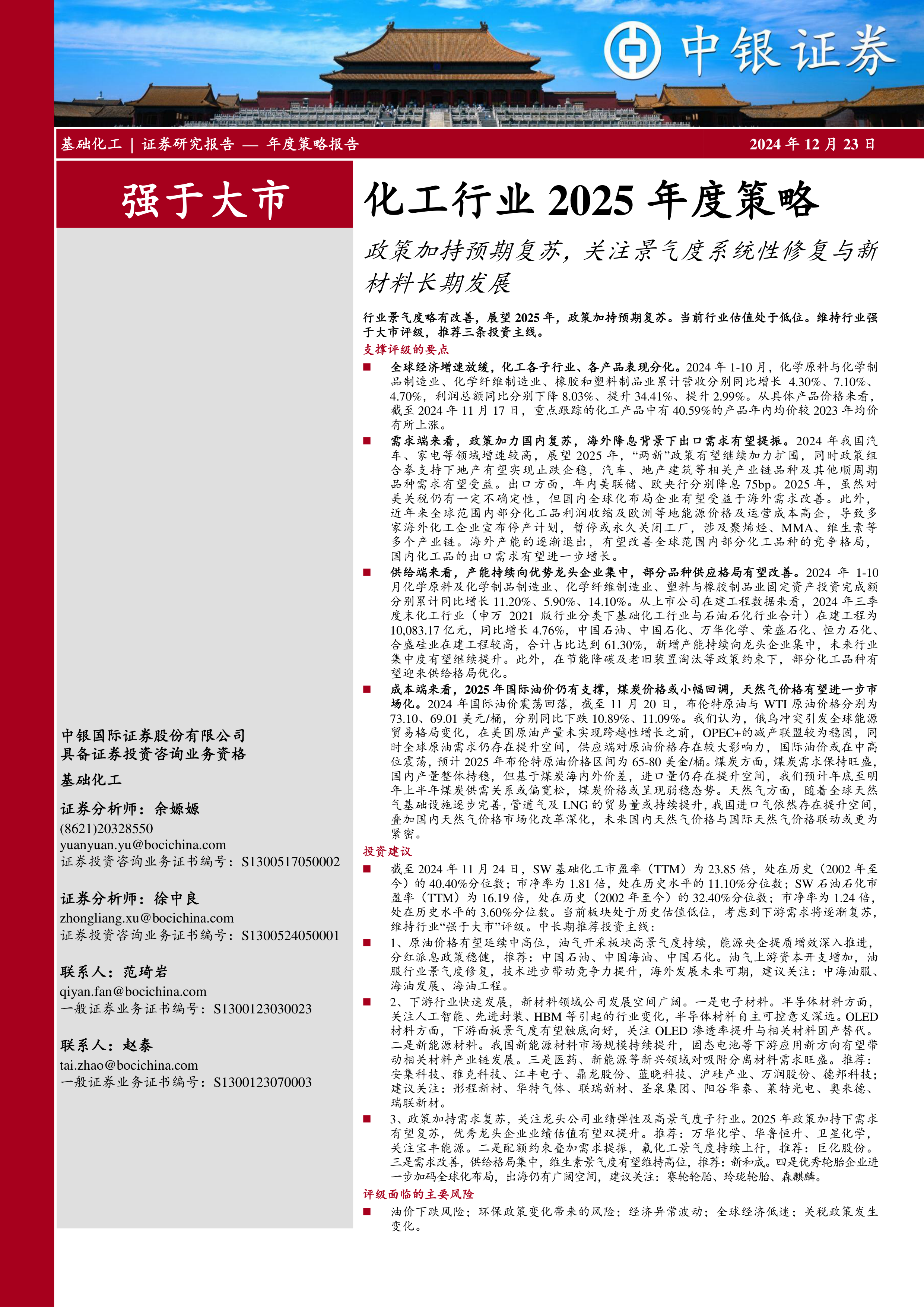 本报告基于对2024年中国基础化工行业数据的分析,并结合宏观经济形势和政策环境,对2025年中国基础化工行业的发展趋势进行了展望。报告认为,2025年中国基础化工行业将迎来复苏,主要驱动力包括国内政策支持、下游需求回暖以及全球供给格局变化。报告建议投资者关注油气上游、新材料和高景气度子行业龙头企业,并提示了投资该行业可能面临的风险。 报告中提供了大量数据图表支持其分析和结论,并对推荐的投资标的进行了详细的分析,为投资者提供了较为全面的参考信息。
