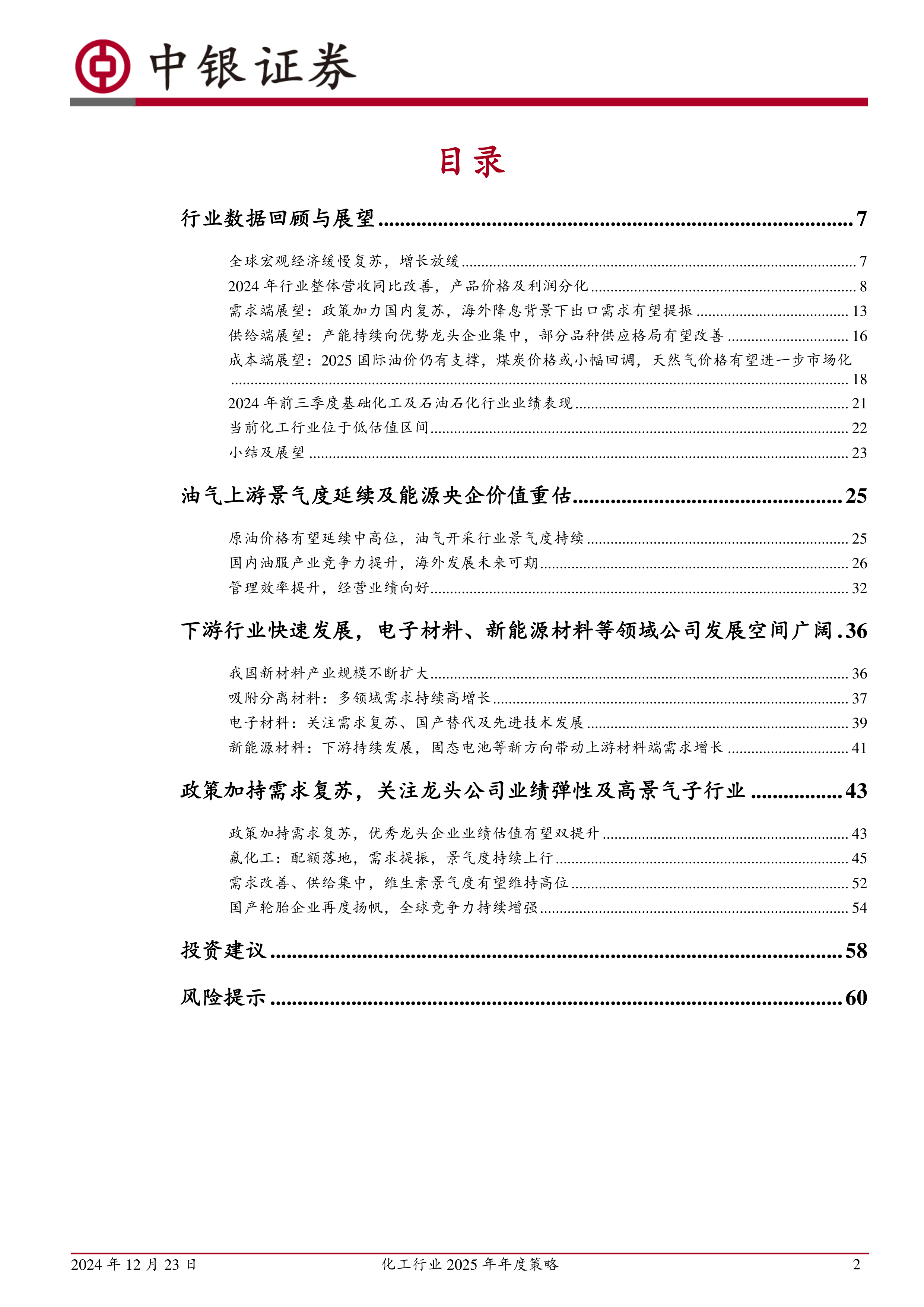 本报告的核心观点是:2025年中国基础化工行业将呈现复苏态势,主要受政策支持、下游需求回暖以及全球供给格局变化的驱动。尽管全球经济增速放缓,但国内政策的积极作用以及海外部分化工产能的退出,将为中国化工企业带来新的机遇。报告建议关注三个投资主线:油气上游、新材料和高景气度子行业龙头企业。