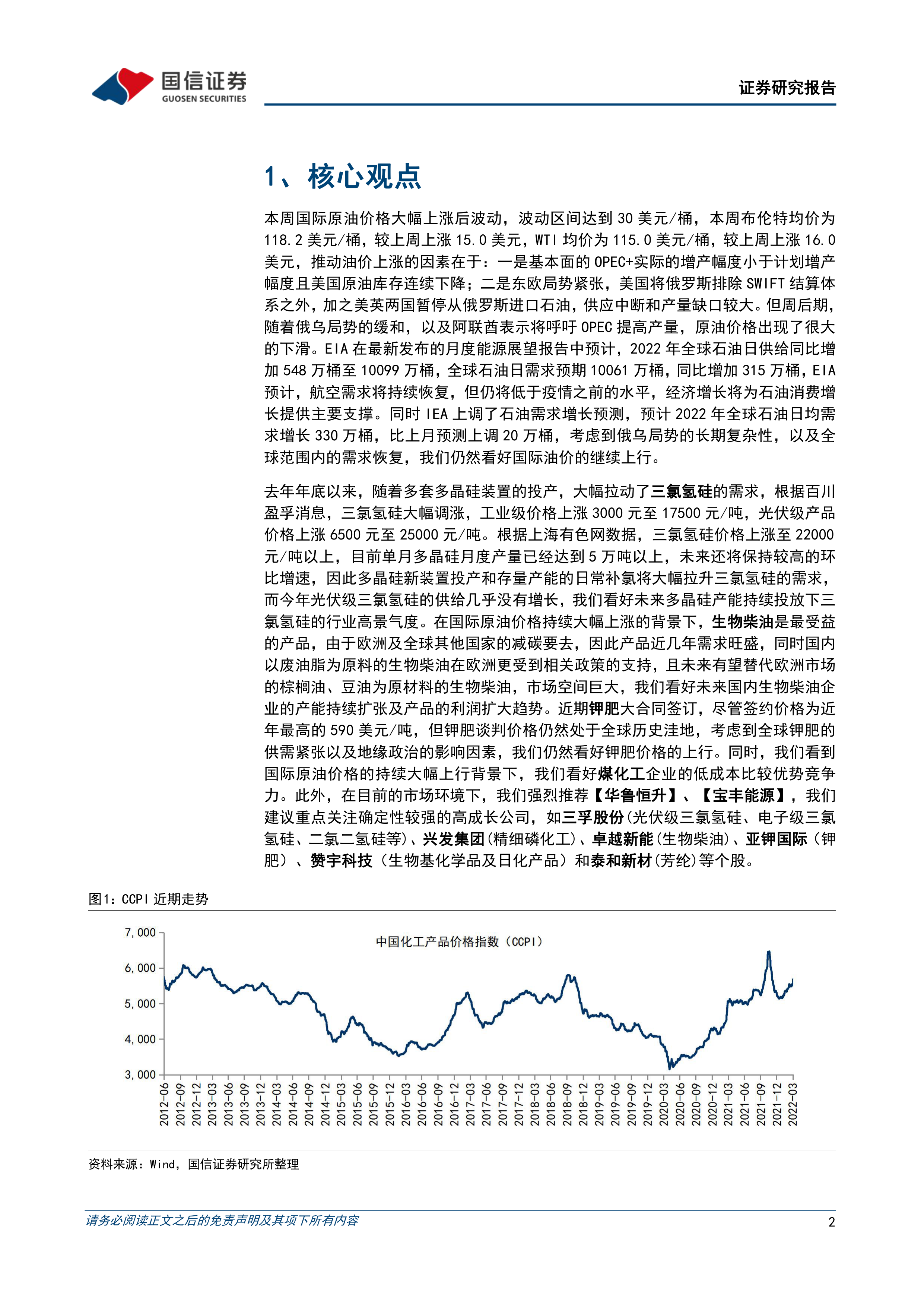本周国际原油价格大幅上涨后波动, 波动区间达到 30 美元/桶, 推动油价上涨的因素在于: 一是基本面的 OPEC+实际的增产幅度小于计划增产幅度且美国原油库存连续下降; 二是东欧局势紧张, 美国将俄罗斯排除 SWIFT 结算体系之外, 加之美英两国暂停从俄罗斯进口石油, 供应中断和产量缺口较大。 但周后期, 随着俄乌局势的缓和, 以及阿联酋表示将呼吁 OPEC 提高产量, 原油价格出现了很大的下滑。 去年年底以来, 随着多套多晶硅装置的投产, 大幅拉动了三氯氢硅的需求,三氯氢硅价格上涨至 22000 元/吨以上, 多晶硅新装置投产和存量产能的日常补氯将大幅拉升三氯氢硅的需求, 而今年光伏级三氯氢硅的供给几乎没有增长, 我们看好未来多晶硅产能持续投放下三氯氢硅的行业高景气度。 在国际原油价格持续大幅上涨的背景下, 生物柴油是最受益的产品, 由于欧洲及全球其他国家的减碳要去, 因此产品近几年需求旺盛, 同时国内以废油脂为原料的生物柴油在欧洲更受到相关政策的支持, 且未来有望替代欧洲市场的棕榈油、 豆油为原材料的生物柴油, 市场空间巨大, 我们看好未来国内生物柴油企业的产能持续扩张及产品的利润扩大趋势。 近期钾肥大合同签订, 尽管签约价格为近年最高的 590 美元/吨, 但钾肥谈判价格仍然处于全球历史洼地, 考虑到全球钾肥的供需紧张以及地缘政治的影响因素, 我们仍然看好钾肥价格的上行。 同时, 我们看到国际原油价格的持续大幅上行背景下, 我们看好煤化工企业的低成本比较优势竞争力。此外,在目前的市场环境下, 我们强烈推荐【华鲁恒升】 、 【宝丰能源】 , 我们建议重点关注确定性较强的高成长公司, 如三孚股份(光伏级三氯氢硅、 电子级三氯氢硅、 二氯二氢硅等)、 兴发集团(精细磷化工)、 卓越新能(生物柴油)、 亚钾国际(钾肥) 、 赞宇科技(生物基化学品及日化产品) 和泰和新材(芳纶)等个股。 。