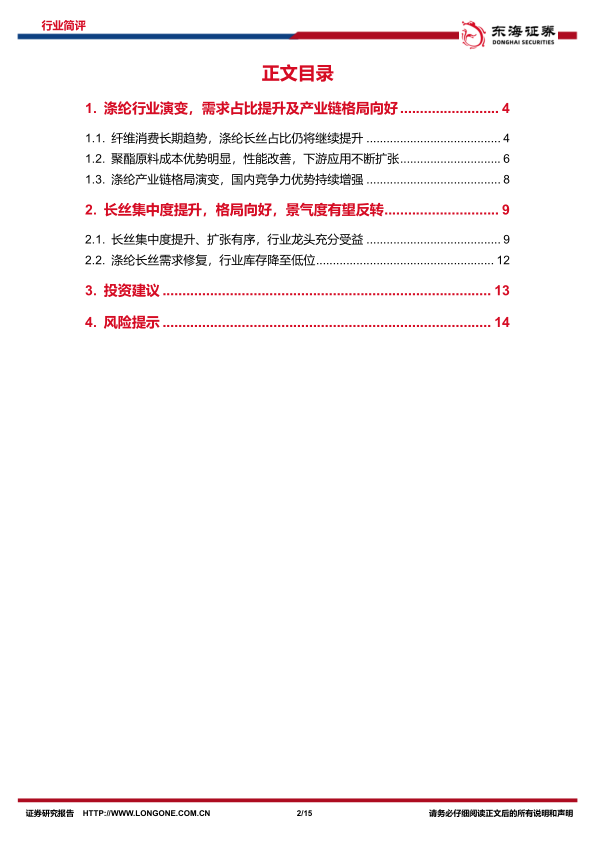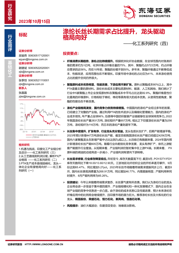 报告最后给出了投资建议,推荐涤纶长丝及大炼化的行业龙头企业,并提示了油价波动、在建项目变动以及地缘政治风险等潜在风险。