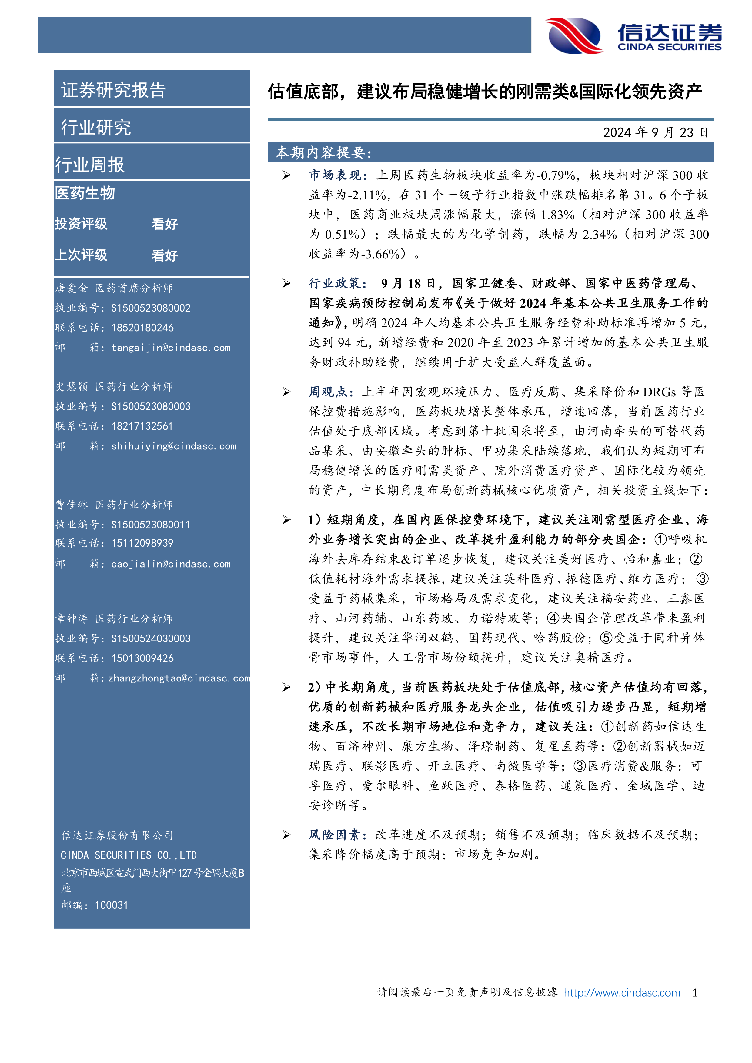 行业政策:9月18日,国家卫健委、财政部、国家中医药管理局、国家疾病预防控制局发布《关于做好2024年基本公共卫生服务工作的通知》,明确2024年人均基本公共卫生服务经费补助标准再增加5元,达到94元,新增经费和2020年至2023年累计增加的基本公共卫生服务财政补助经费,继续用于扩大受益人群覆盖面。