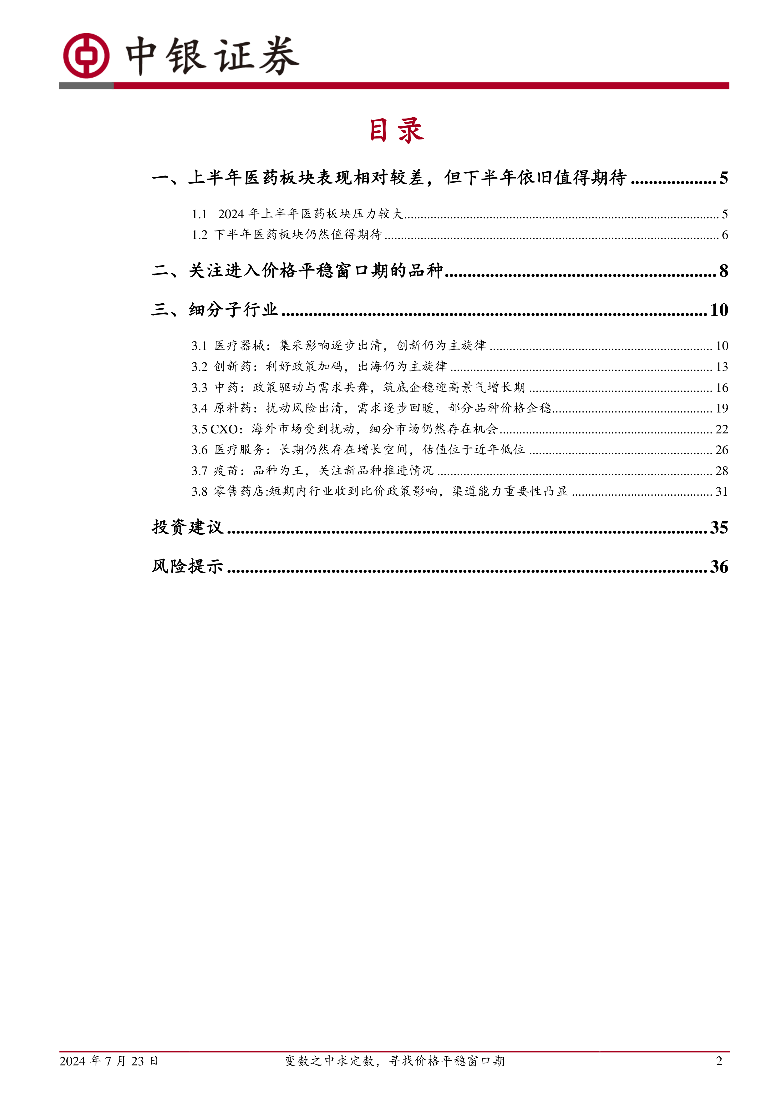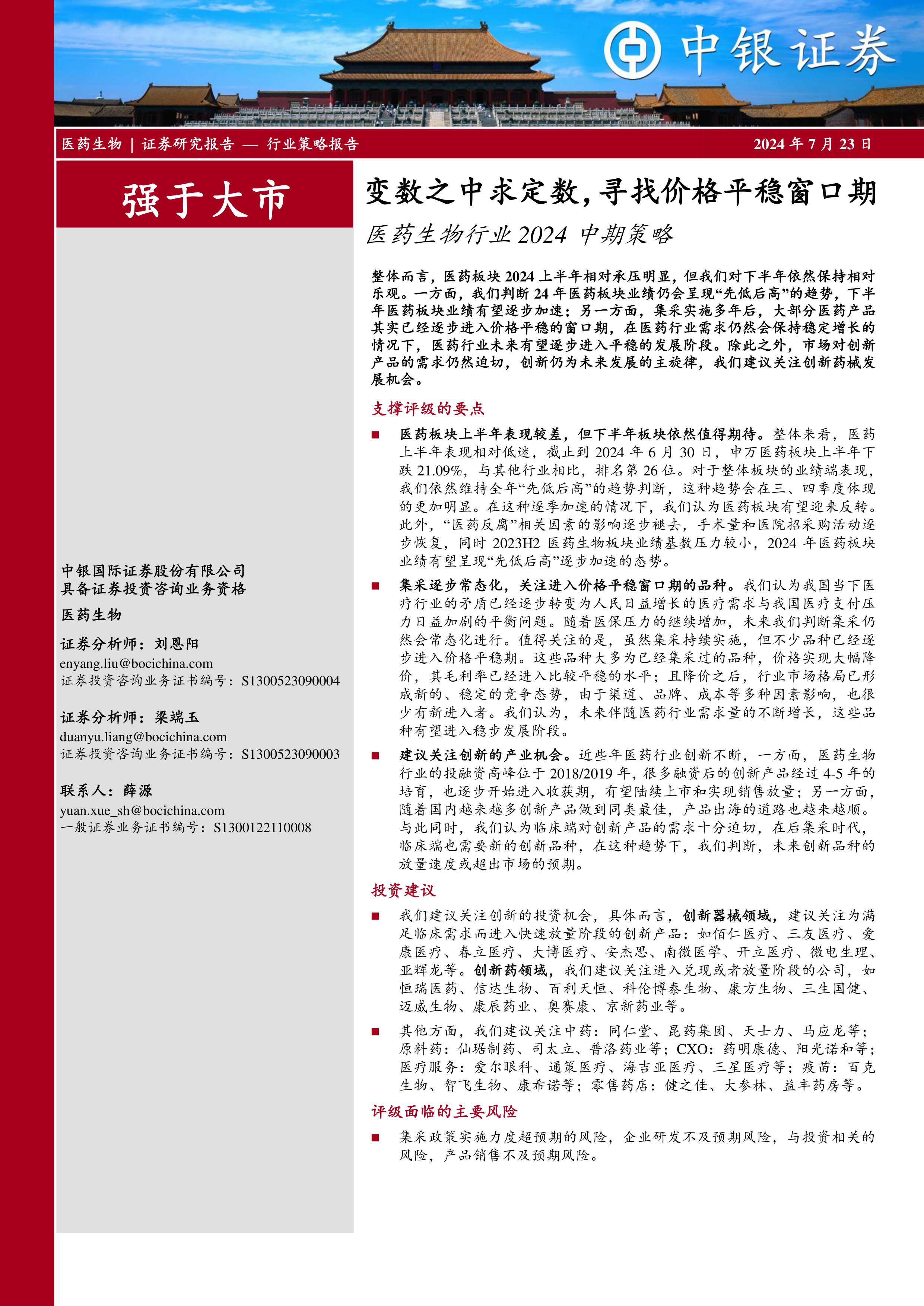 整体而言,医药板块2024上半年相对承压明显,但我们对下半年依然保持相对乐观。一方面,我们判断24年医药板块业绩仍会呈现“先低后高”的趋势,下半年医药板块业绩有望逐步加速;另一方面,集采实施多年后,大部分医药产品其实已经逐步进入价格平稳的窗口期,在医药行业需求仍然会保持稳定增长的情况下,医药行业未来有望逐步进入平稳的发展阶段。除此之外,市场对创新产品的需求仍然迫切,创新仍为未来发展的主旋律,我们建议关注创新药械发展机会。