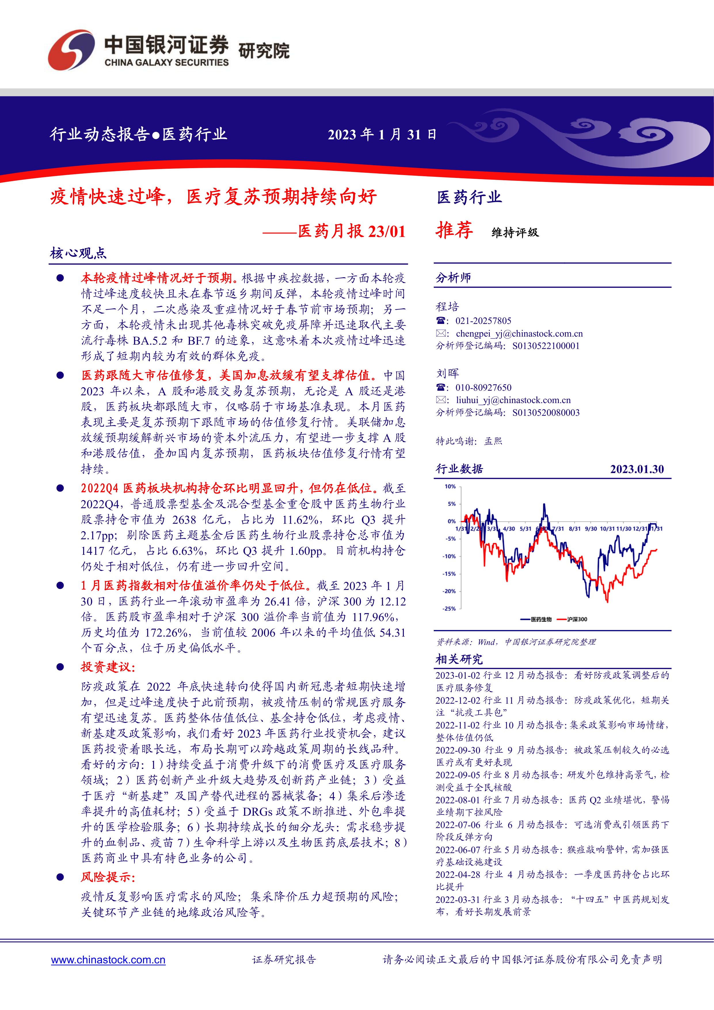 本报告基于公开数据和市场分析,对2023年1月中国医药行业进行了全面的分析。报告指出,尽管短期内受到疫情的影响,但医药行业整体呈现出积极的复苏态势。疫情快速过峰、估值修复、机构持仓回升等因素都为医药行业未来的发展提供了有利条件。然而,投资者仍需关注潜在的风险,并进行独立的判断。报告最后给出了具体的投资建议和重点关注的股票,为投资者提供了参考。