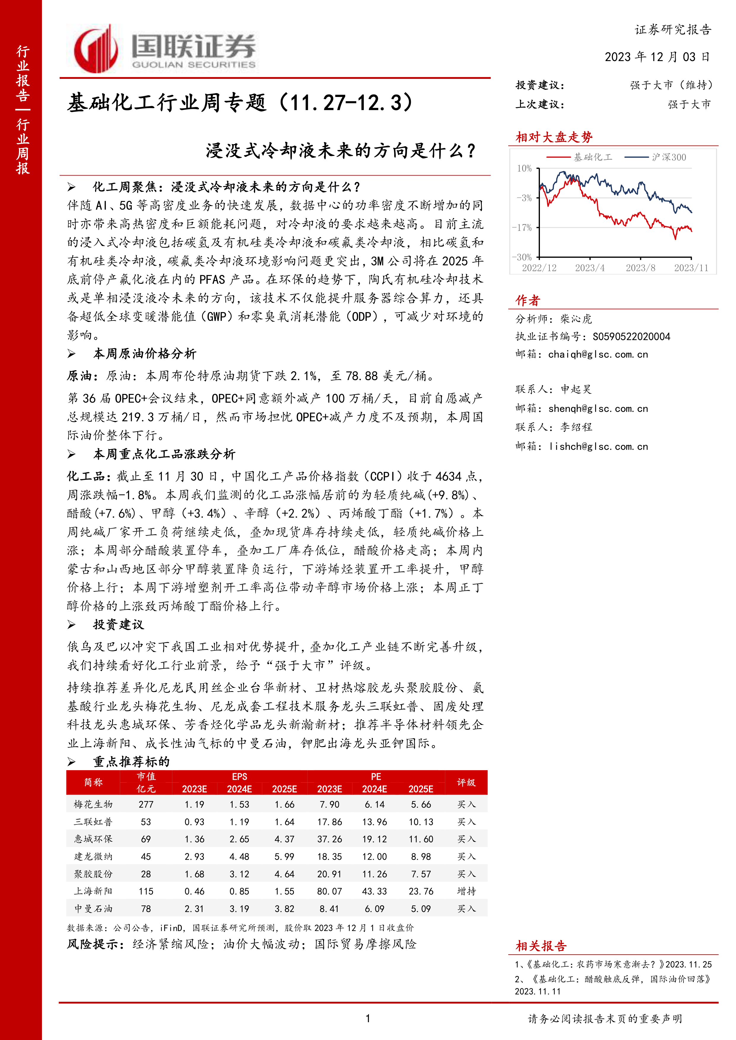 本报告的核心观点是:基于对基础化工行业,特别是浸没式冷却液市场及原油价格的分析,国联证券维持对基础化工行业的“强于大市”评级。报告重点关注了浸没式冷却液环保趋势下的技术发展方向,以及原油价格波动对化工品价格的影响,并推荐了一系列具有投资价值的化工企业。