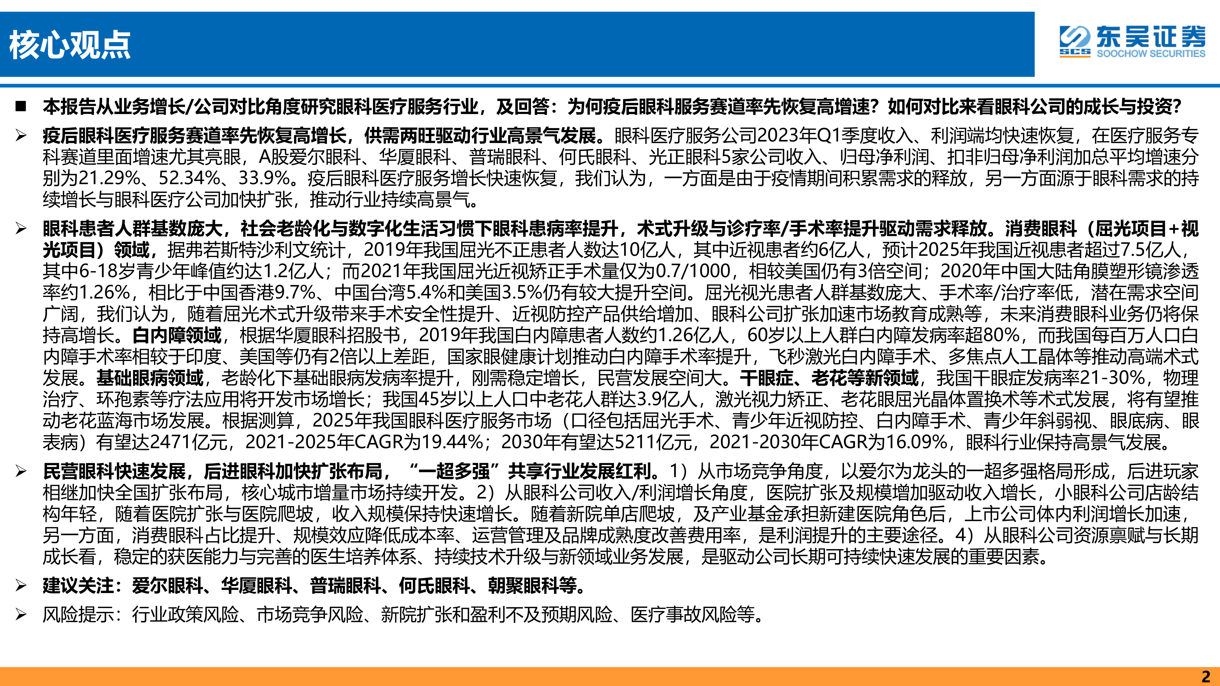本报告基于眼科医疗服务行业现状,从业务增长和公司对比两个视角,分析了疫后眼科赛道快速恢复高增长的原因,并对几家主要眼科公司的成长和投资价值进行了评估。核心观点如下: