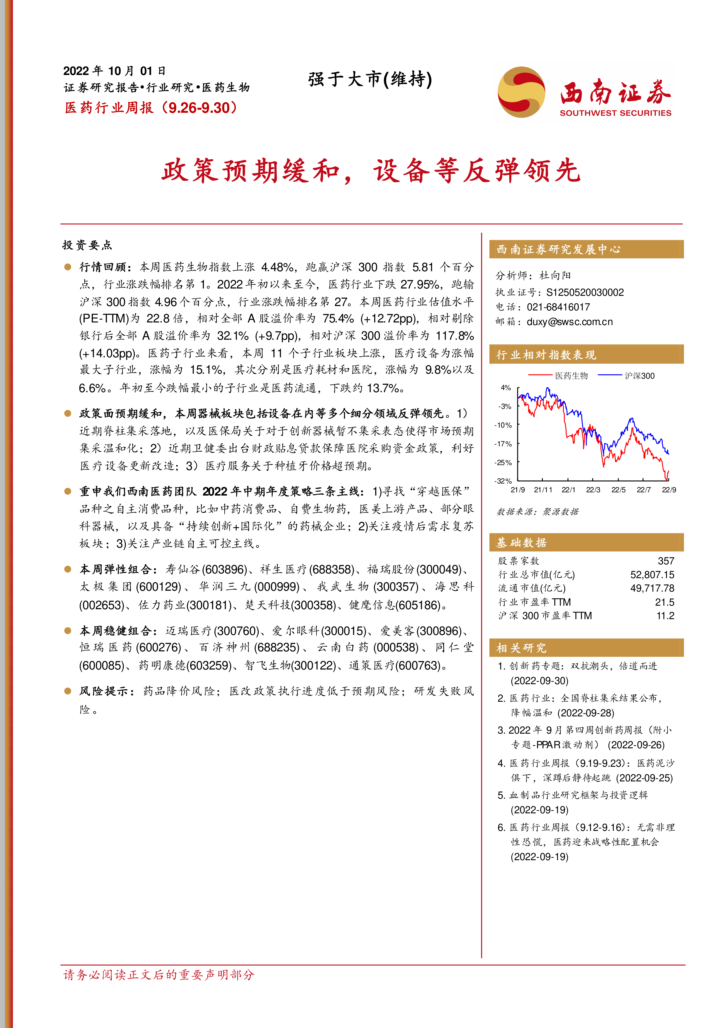 本报告的核心观点是:2022年9月26日至30日,医药生物指数强于大市,跑赢沪深300指数,多个细分领域反弹领先。政策预期缓和,集采温和化,利好医疗设备更新改造。西南证券维持医药行业“强于大市”评级,并推荐两类投资组合:弹性组合和稳健组合,分别侧重于高增长潜力和稳定收益。报告同时分析了医药行业二级市场表现、新冠疫苗进展、最新政策新闻以及重点公司盈利预测和估值。