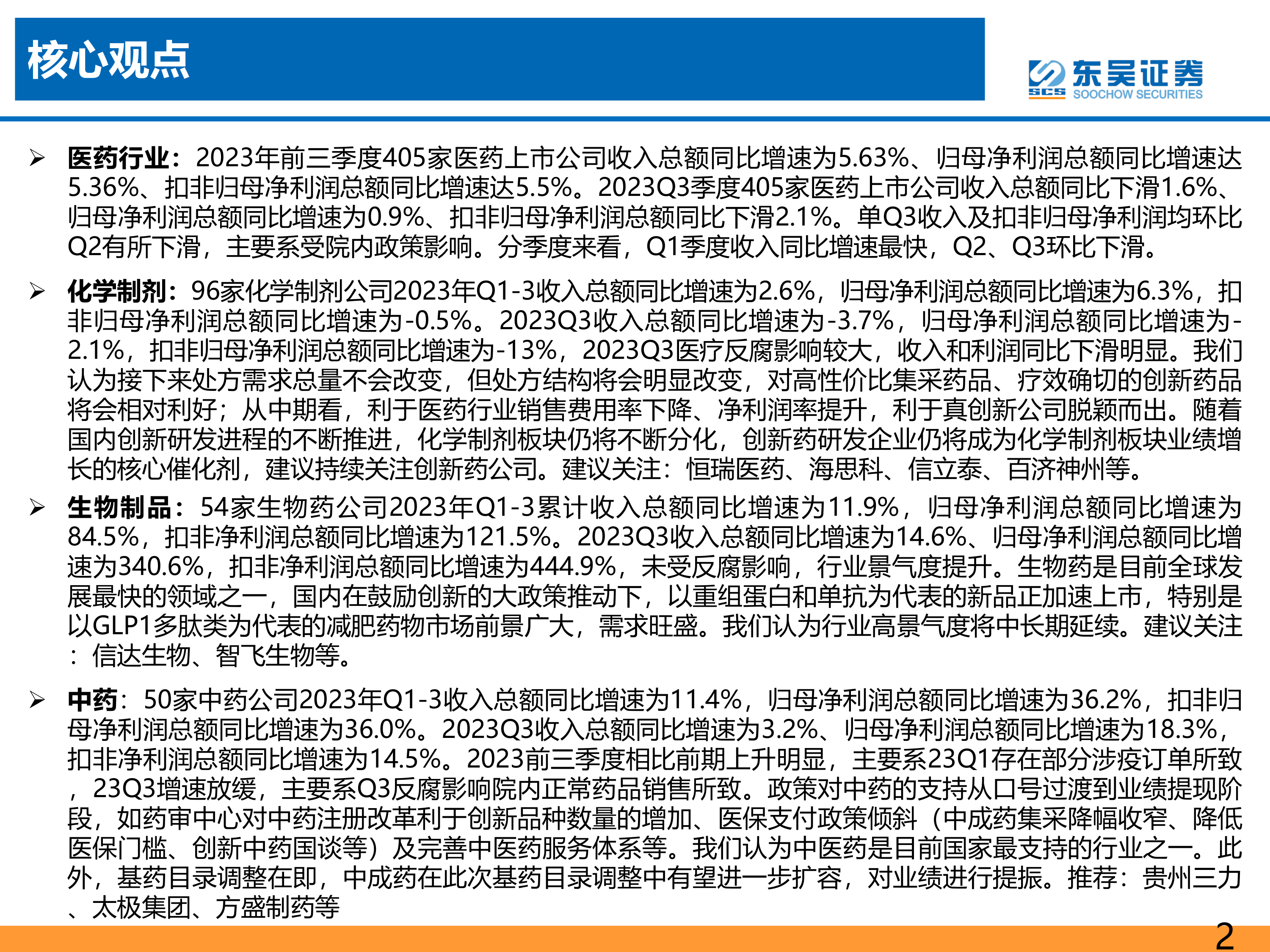 化学制剂: 96家化学制剂公司2023年Q1-3收入总额同比增速为2.6%, 归母净利润总额同比增速为6.3%, 扣非归母净利润总额同比增速为-0.5%。 2023Q3收入总额同比增速为-3.7%, 归母净利润总额同比增速为-2.1%, 扣非归母净利润总额同比增速为-13%, 2023Q3医疗反腐影响较大, 收入和利润同比下滑明显。 我们认为接下来处方需求总量不会改变, 但处方结构将会明显改变, 对高性价比集采药品、 疗效确切的创新药品将会相对利好;从中期看, 利于医药行业销售费用率下降、 净利润率提升, 利于真创新公司脱颖而出。 随着国内创新研发进程的不断推进, 化学制剂板块仍将不断分化, 创新药研发企业仍将成为化学制剂板块业绩增长的核心催化剂, 建议持续关注创新药公司。 建议关注:恒瑞医药、 海思科、 信立泰、 百济神州等。