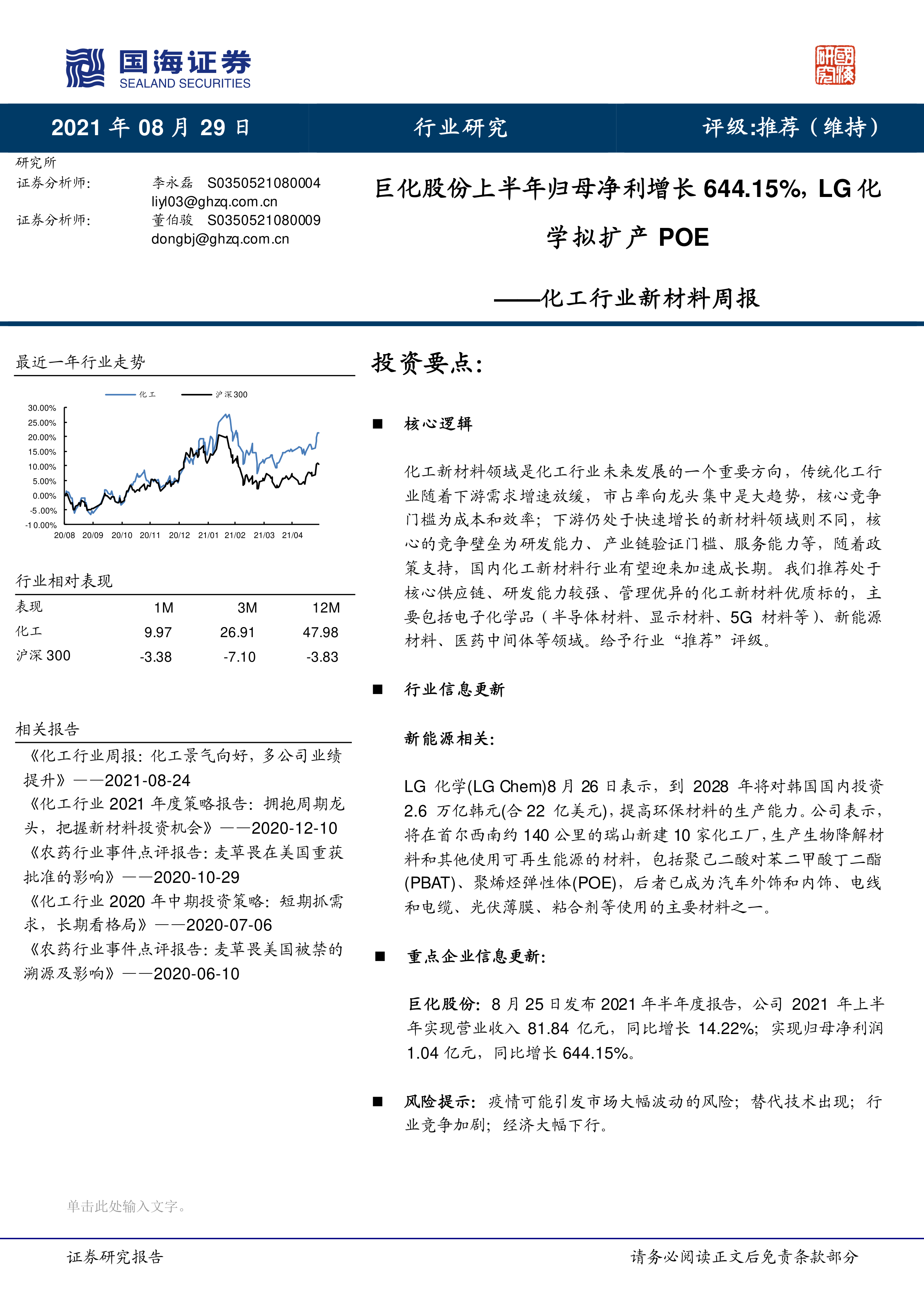 化工行业新材料周报:巨化股份上半年归母净利增长644.15%,LG化学拟扩产POE