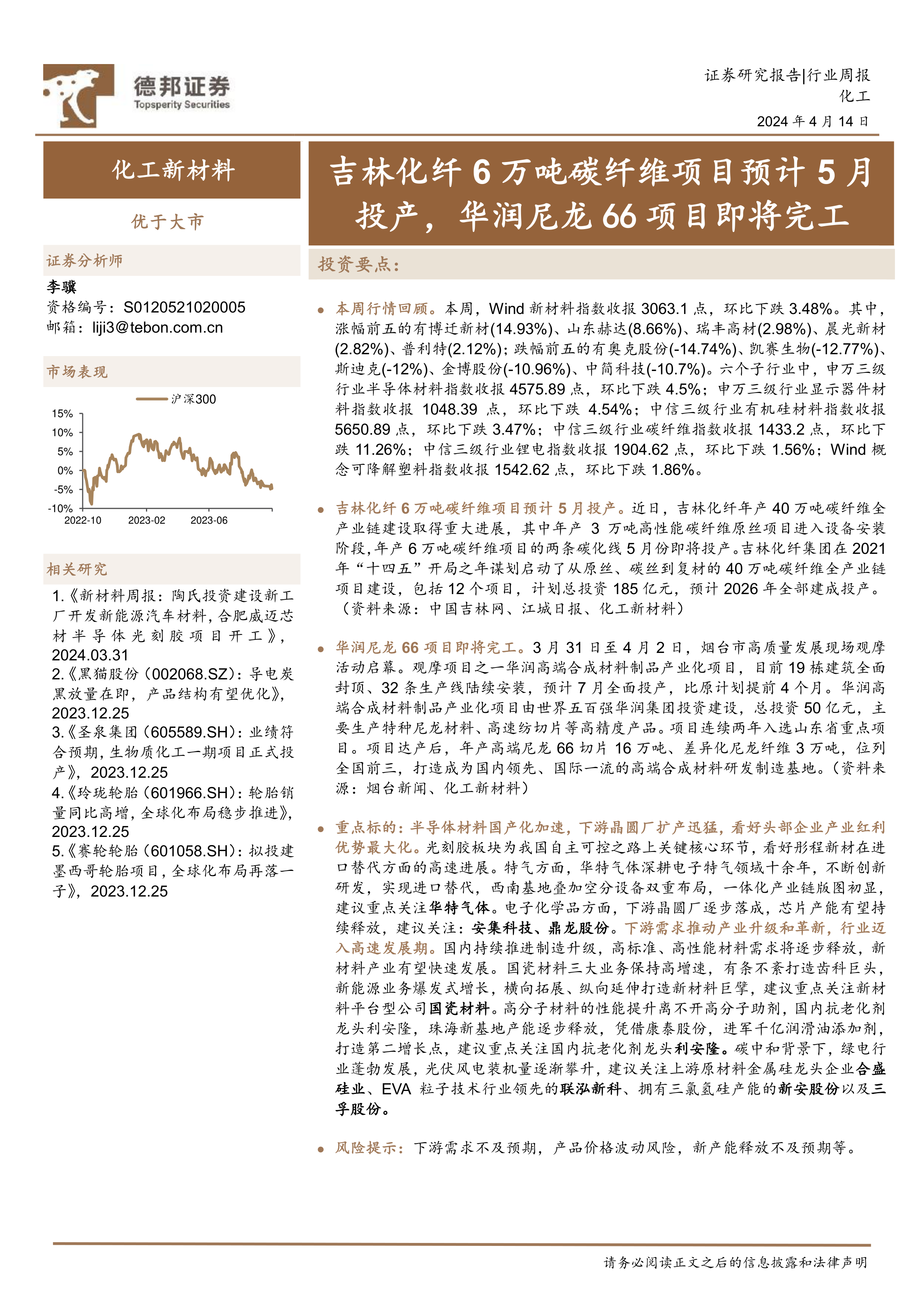 化工行业周报:吉林化纤6万吨碳纤维项目预计5月投产,华润尼龙66项目即将完工