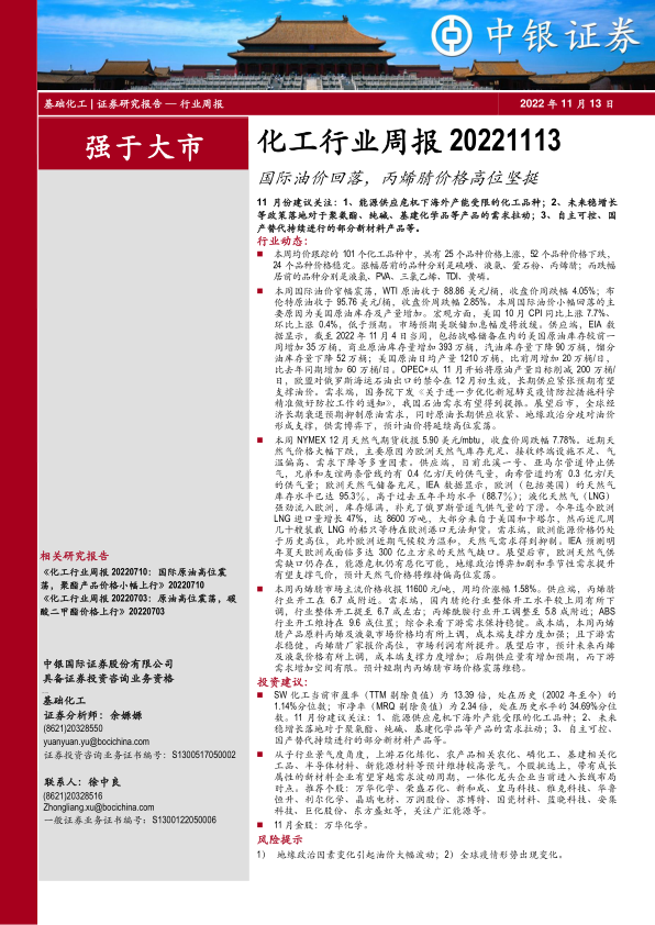 本报告的核心观点是:国际油价回落,但仍维持高位震荡;国内化工行业表现分化,部分品种价格上涨,部分品种价格下跌;未来应关注能源供应危机下海外产能受限的化工品种、稳增长政策带来的需求拉动以及国产替代进程中的新材料产品。