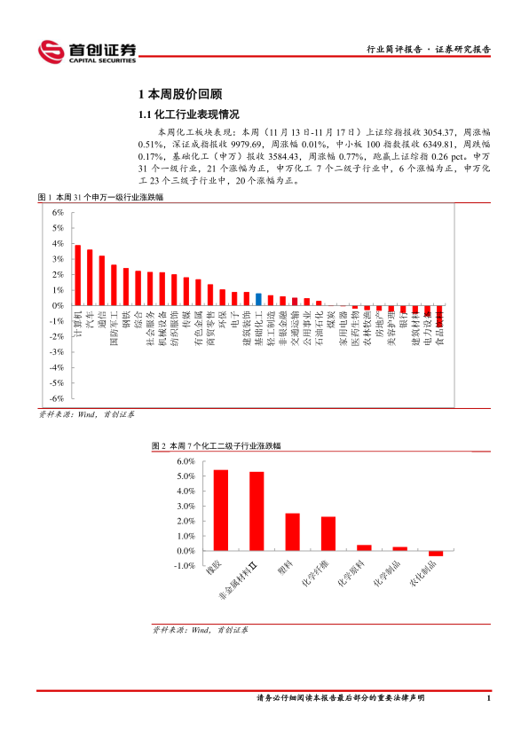 本周化工板块表现:本周(11月13日-11月17日)上证综指报收3054.37,周涨幅0.51%,深证成指报收9979.69,周涨幅0.01%,中小板100指数报收6349.81,周跌幅0.17%,基础化工(申万)报收3584.43,周涨幅0.77%,跑赢上证综指0.26pct。申万31个一级行业,21个涨幅为正,申万化工7个二级子行业中,6个涨幅为正,申万化工23个三级子行业中,20个涨幅为正。涨幅居前的个股有联瑞新材、龙高股份、天铁股份、至正股份、科创新源、中研股份、锦鸡股份、扬帆新材、和远气体、海达股份等。