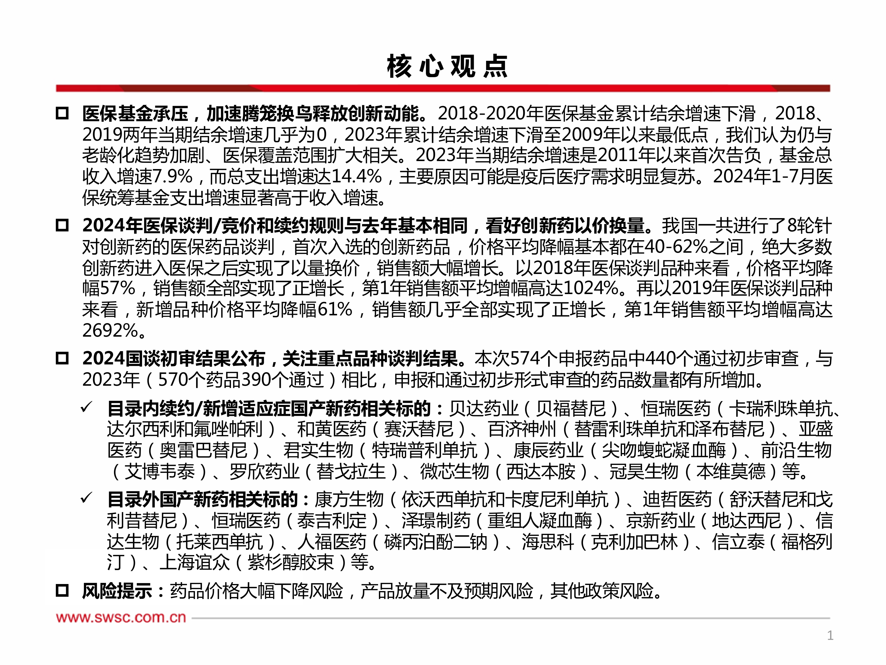本报告的核心观点是:2024年国家医保谈判在医保基金持续承压的背景下进行,谈判规则与去年基本相同,创新药仍有望通过“以价换量”实现销售额增长。报告分析了医保基金收支数据,预测了2024年医保谈判的走向,并重点关注了部分重点品种的谈判结果。