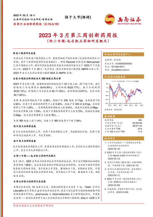 本报告的核心观点是:2023年3月第三周,医药行业创新药市场表现分化,A股创新药板块跑输大盘,而港股创新药板块跑赢大盘。新冠口服药研发持续推进,国内外均有新药获批上市或进入临床后期阶段。IL-5靶点药物研发也取得进展,GSK美泊利珠单抗在华申报新适应症。此外,报告还对本周国内外重点创新药进展及交易情况进行了统计分析。