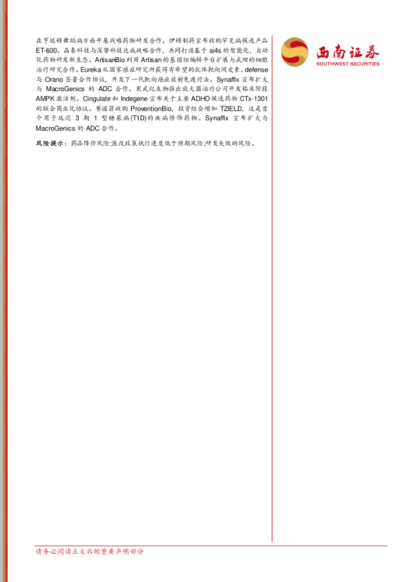 风险提示:药品降价风险;医改政策执行进度低于预期风险;研发失败的风险。
