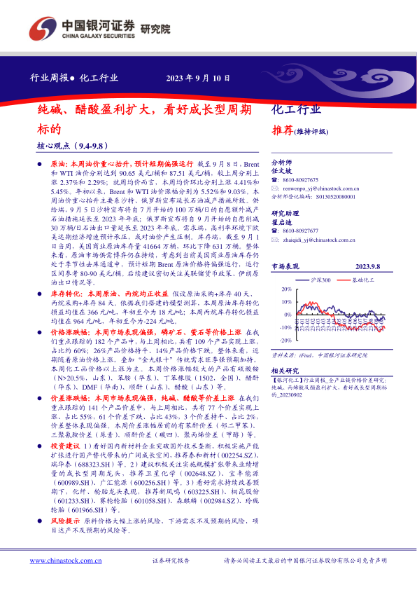 本报告基于对化工行业近期市场表现的统计分析,指出本周化工品价格和价差整体偏强,原油价格上涨和“金九银十”旺季预期是主要驱动因素。纯碱和醋酸盈利扩大,表现突出。报告最后给出了具体的投资建议和风险提示,为投资者提供参考。 报告详细分析了各个产业链重点产品的价格、价差及其涨跌幅,并对部分产品价格变动的原因进行了深入解读,为投资者提供了全面的市场信息和专业的投资建议。 需要注意的是,报告中的数据和分析仅供参考,投资者应结合自身情况进行独立判断,并承担相应的投资风险。