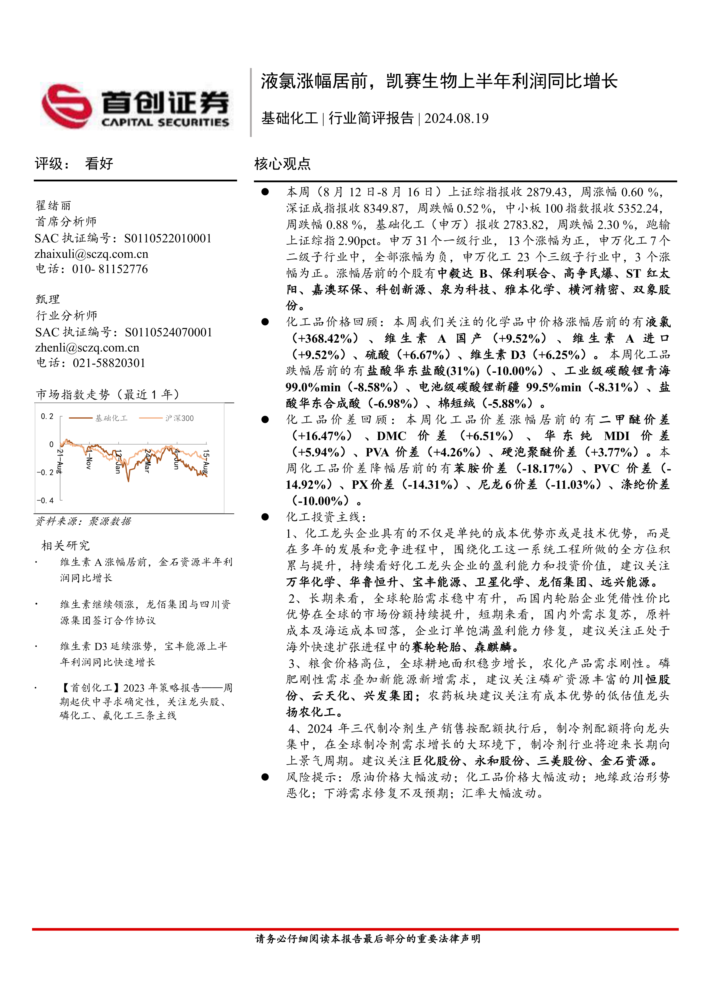基础化工行业简评报告:液氯涨幅居前,凯赛生物上半年利润同比增长