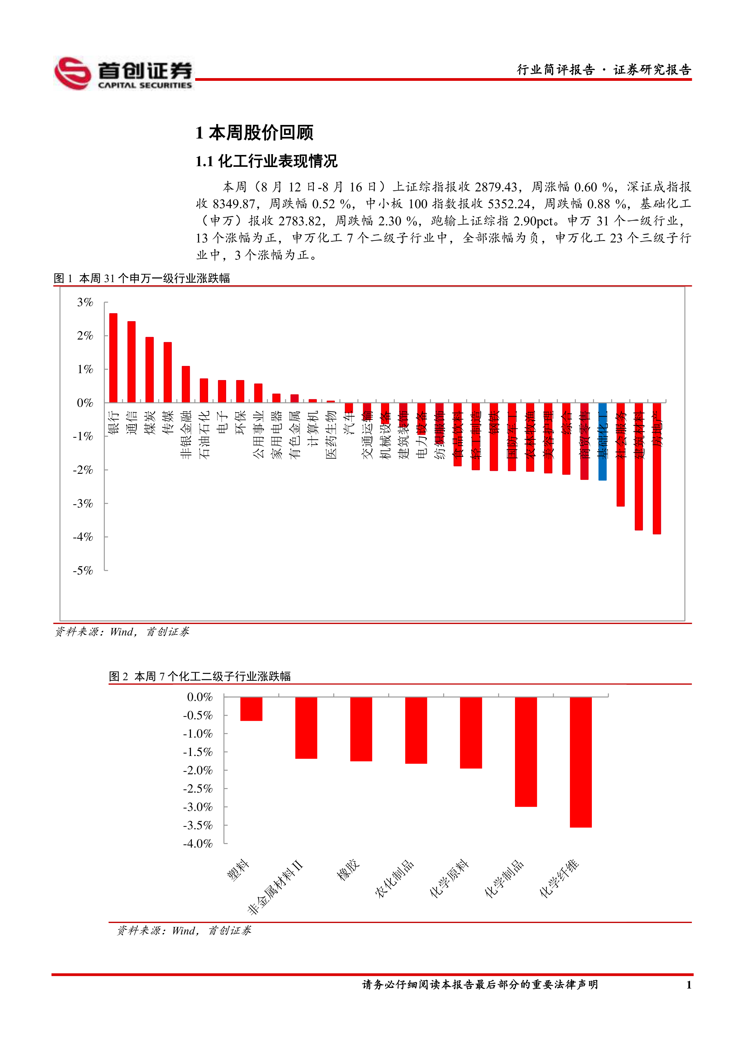 本周(8月12日-8月16日)上证综指报收2879.43,周涨幅0.60%,深证成指报收8349.87,周跌幅0.52%,中小板100指数报收5352.24,周跌幅0.88%,基础化工(申万)报收2783.82,周跌幅2.30%,跑输上证综指2.90pct。申万31个一级行业,13个涨幅为正,申万化工7个二级子行业中,全部涨幅为负,申万化工23个三级子行业中,3个涨幅为正。涨幅居前的个股有中毅达B、保利联合、高争民爆、ST红太阳、嘉澳环保、科创新源、泉为科技、雅本化学、横河精密、双象股份。