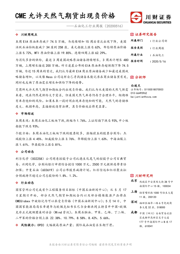 本报告对2020年5月16日一周的石油化工行业市场行情进行了回顾和分析。报告指出,原油市场供需关系出现变化,美国原油库存下降,但原因复杂;天然气市场供大于求,但短期内库存饱和风险较低;石油化工板块整体表现低迷,部分个股出现波动;行业动态方面,全球和中国石油化工行业面临诸多挑战和机遇。 报告还提供了详细的市场数据和图表,为投资者提供参考。 需要注意的是,报告中提到的市场分析和预测仅代表报告发布日的观点,未来市场走势存在不确定性,投资者需谨慎决策。