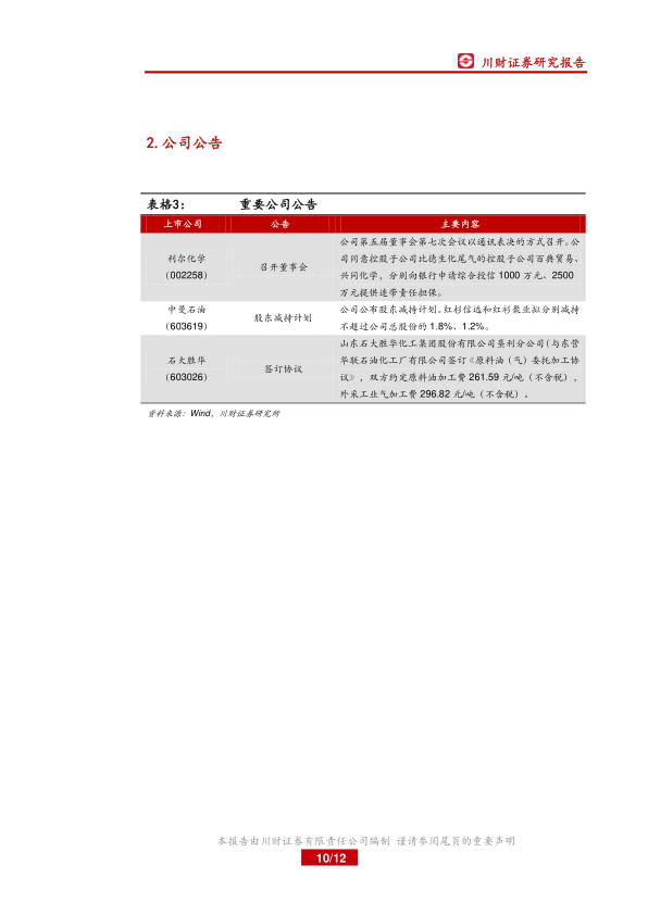 本周石油化工板块整体表现低迷,下跌1.76%,跑输上证综指(下跌0.93%)和中小板指(下跌0.93%)。多数石油化工股票下跌,涨幅前五的股票分别为:杰瑞股份(上涨4.45%)、纽威股份(上涨3.76%)、华锦股份(上涨1.63%)、中海油服(上涨1.61%)、华鼎股份(上涨0.81%)。 报告还列举了利尔化学和中曼石油两家公司的公司公告,分别涉及担保和股东减持计划。