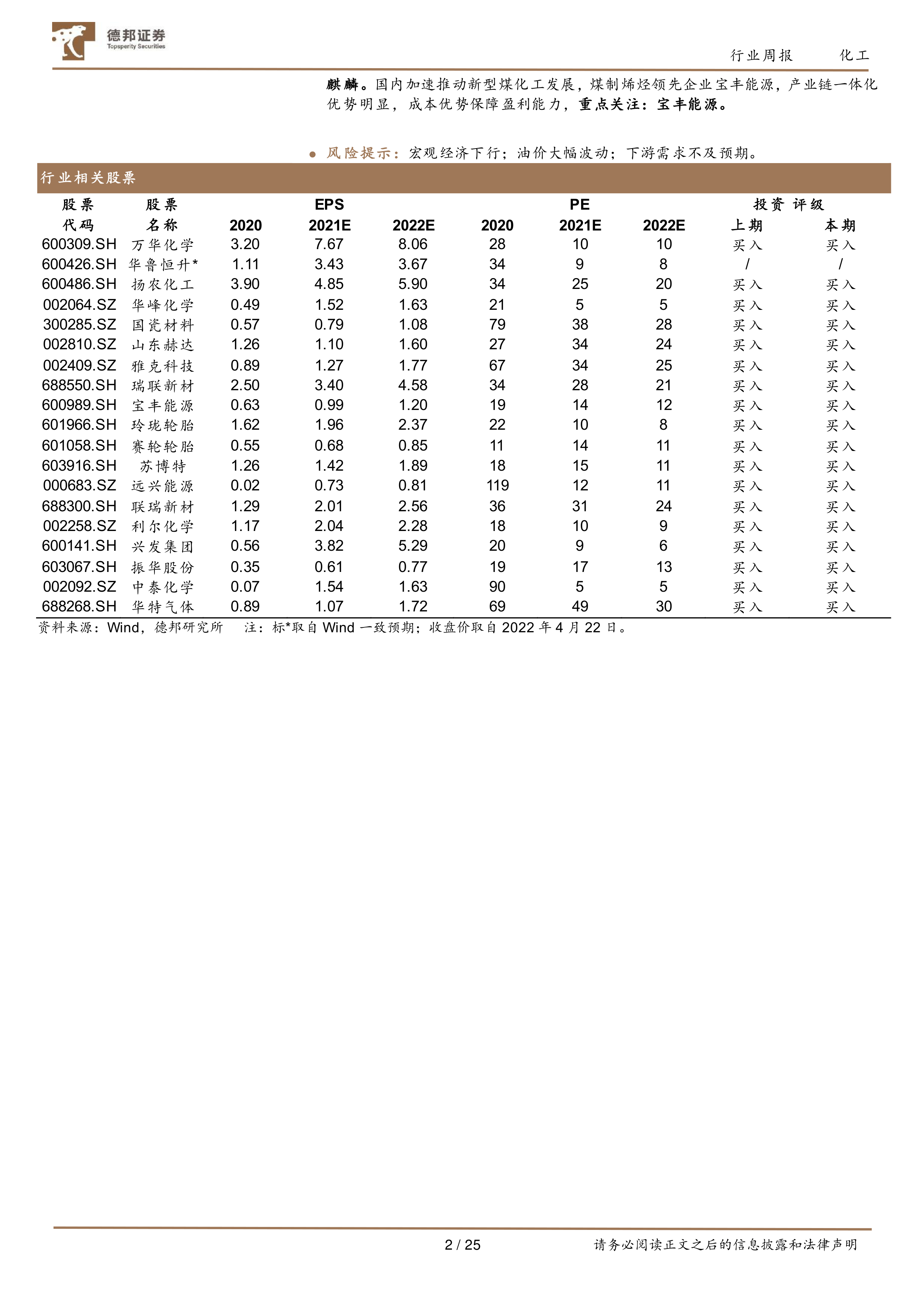本报告的核心观点是:2022年4月18日至24日,化工板块整体表现弱于大市,但部分子行业表现突出,呈现出结构性分化。政策层面,《关于化纤工业高质量发展的指导意见》的出台将加速可降解纤维的发展,利好相关企业。此外,磷肥、草铵膦等产品价格上涨,也为相关企业带来利好。然而,宏观经济下行、油价波动以及下游需求不及预期等风险依然存在。