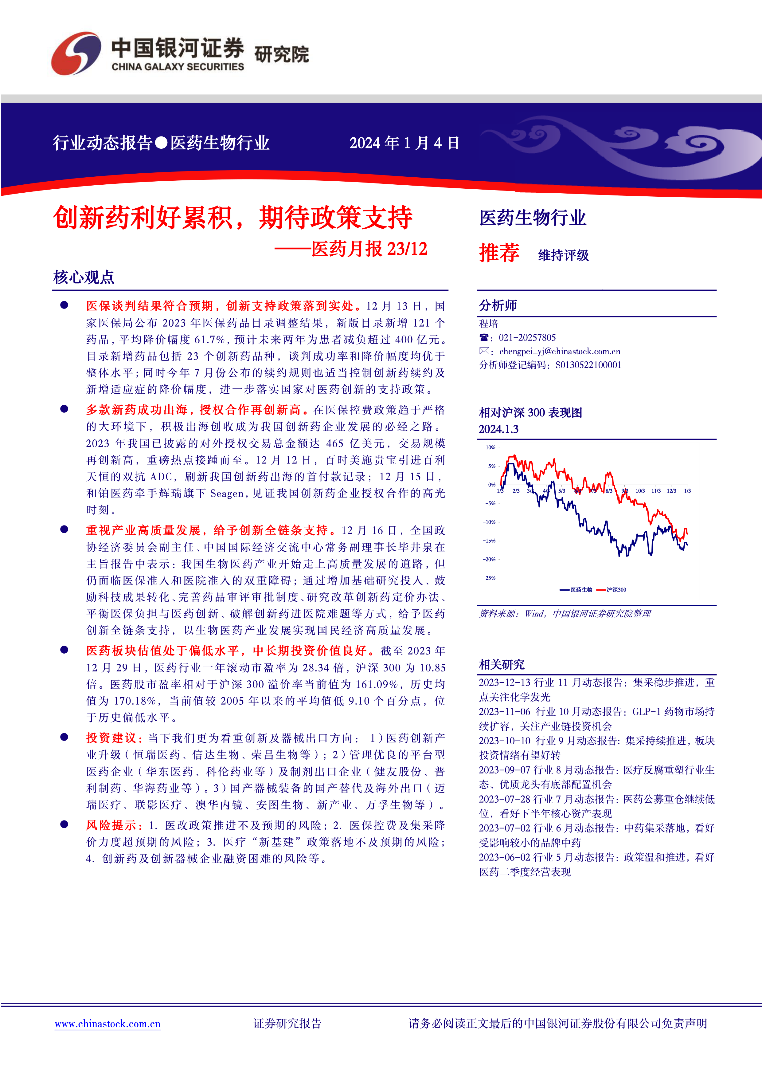本报告的核心观点是:中国医药生物行业在2023年经历了医保谈判、创新药出海和政策支持等一系列重要事件,行业发展呈现出积极与挑战并存的态势。医保谈判结果符合预期,创新药的成功出海和授权合作规模再创新高,国家也出台政策支持医药产业高质量发展。然而,行业仍面临医保控费、医院准入等挑战,估值处于历史偏低水平。因此,建议投资者关注创新药、器械出口以及管理优良的平台型医药企业,并密切关注政策变化和市场风险。