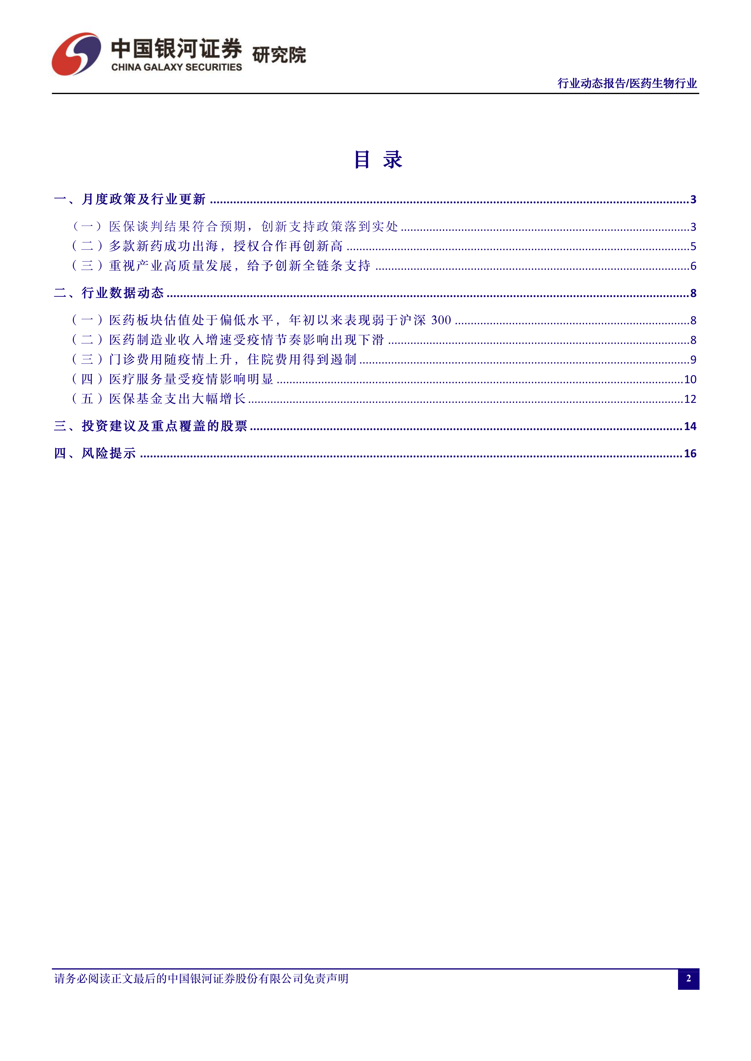风险提示: 1. 医改政策推进不及预期的风险; 2. 医保控费及集采降价力度超预期的风险; 3. 医疗“新基建 ”政策落地不及预期的风险;4. 创新药及创新器械企业融资困难的风险等