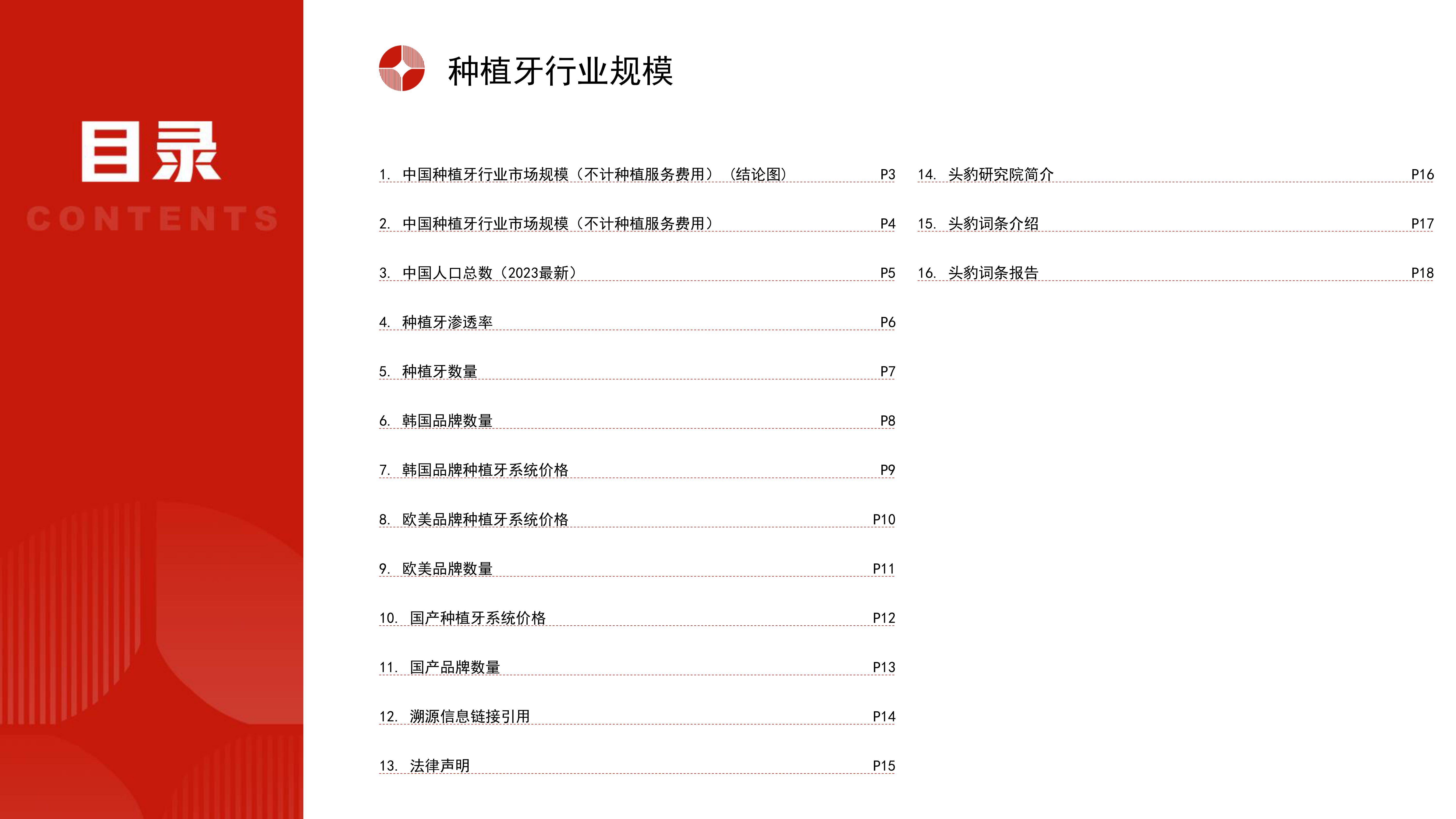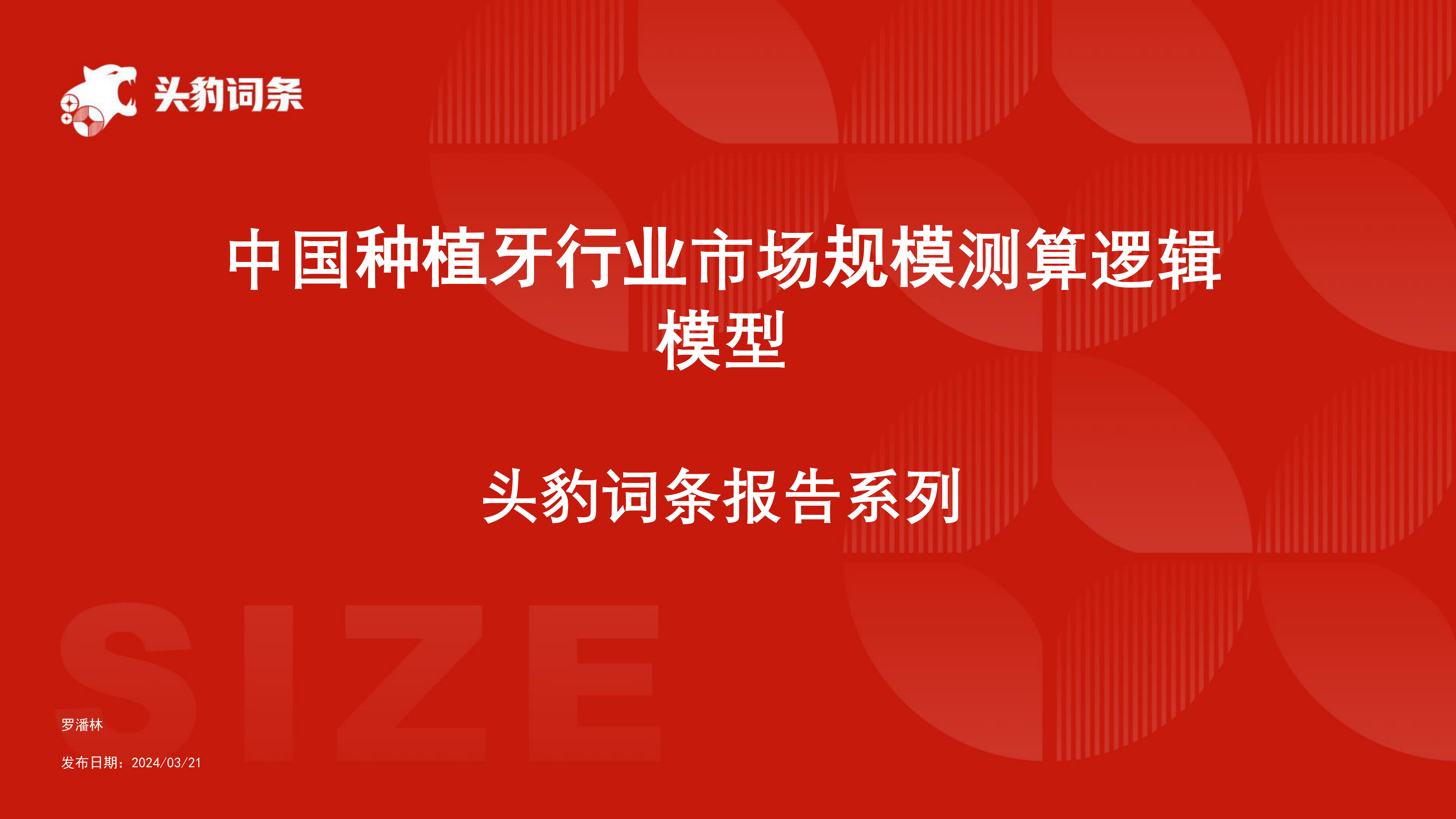 本报告基于头豹研究院发布的《种植牙行业规模中国市场测算逻辑模型》报告,对中国种植牙行业市场规模进行了分析。报告的核心观点是:中国种植牙行业市场规模持续增长,预计未来几年将保持高速增长态势。该增长主要由种植牙渗透率的提高和人口基数的扩大驱动。报告同时对不同品牌(韩国、欧美、国产)的种植牙市场份额及价格进行了分析,并提供了相应的市场规模测算模型。