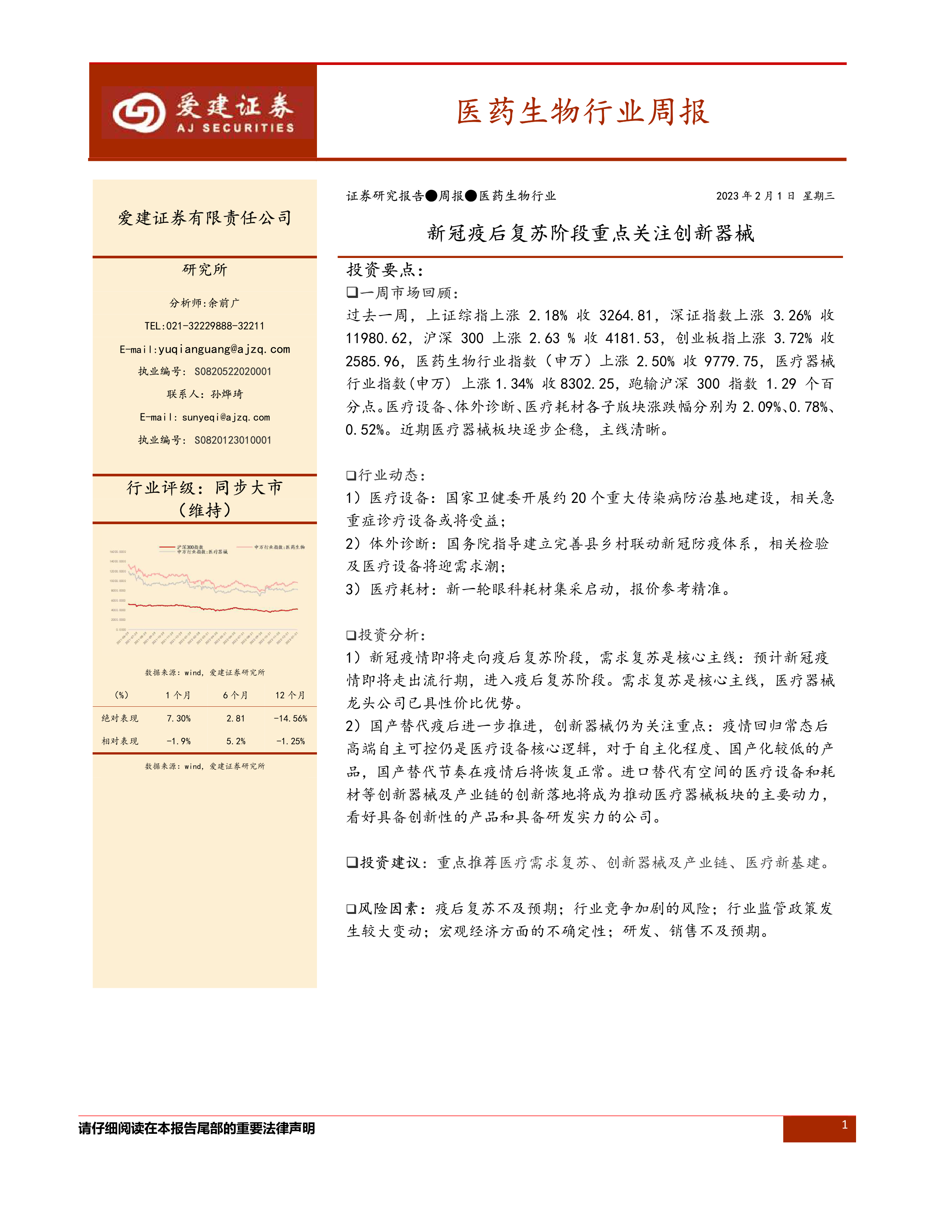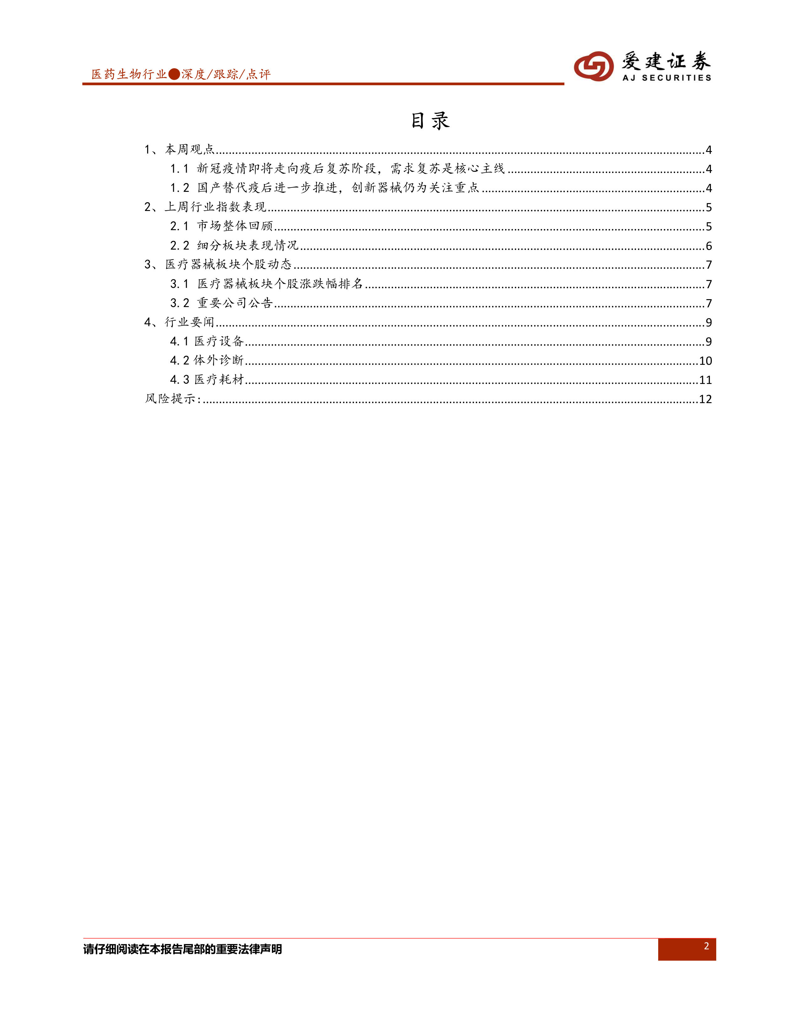 本报告基于对市场数据和行业动态的分析,认为新冠疫情进入疫后复苏阶段,医疗器械行业将迎来新的发展机遇。需求复苏是核心主线,国产替代和创新器械将成为行业发展的重要动力。 报告建议重点关注医疗需求复苏、创新器械及产业链、医疗新基建等领域,并提示了疫后复苏不及预期、行业竞争加剧、政策变动、宏观经济不确定性以及研发销售不及预期等风险因素。 报告中提供的个股信息和公司公告仅供参考,投资者应进行独立判断,谨慎投资。