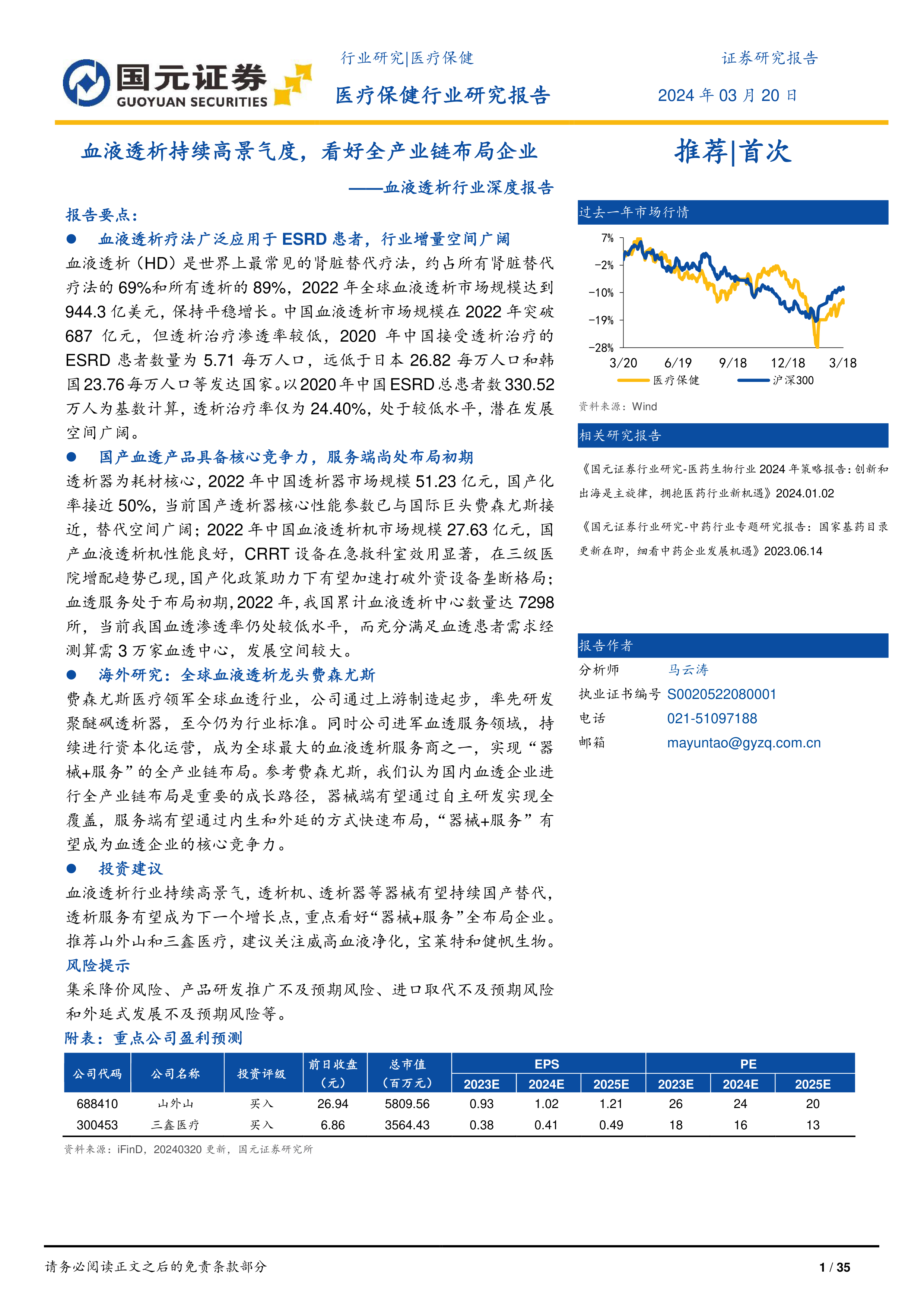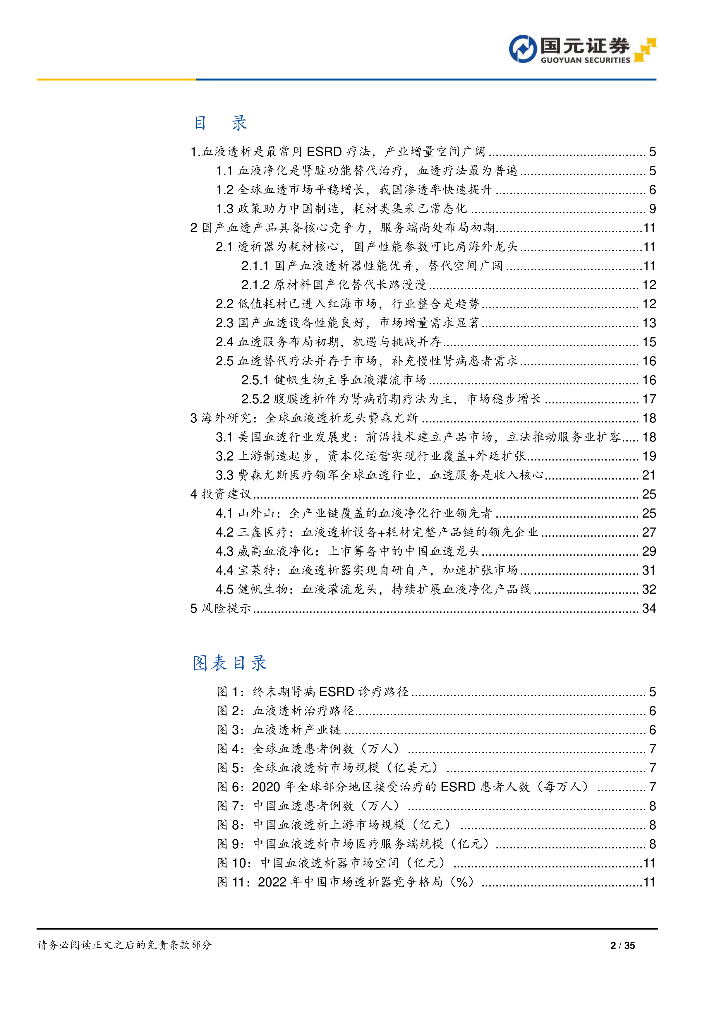 本报告的核心观点是:中国血液透析行业持续高景气,国产替代加速,服务端潜力巨大。透析器、透析机等器械国产化率不断提升,并具备与国际龙头产品相媲美的性能,但上游原材料国产化仍需时日。血透服务市场尚处于布局初期,发展空间广阔,但面临选址限制和商业模式创新等挑战。建议重点关注“器械+服务”全产业链布局企业,推荐山外山和三鑫医疗,建议关注威高血液净化、宝莱特和健帆生物。