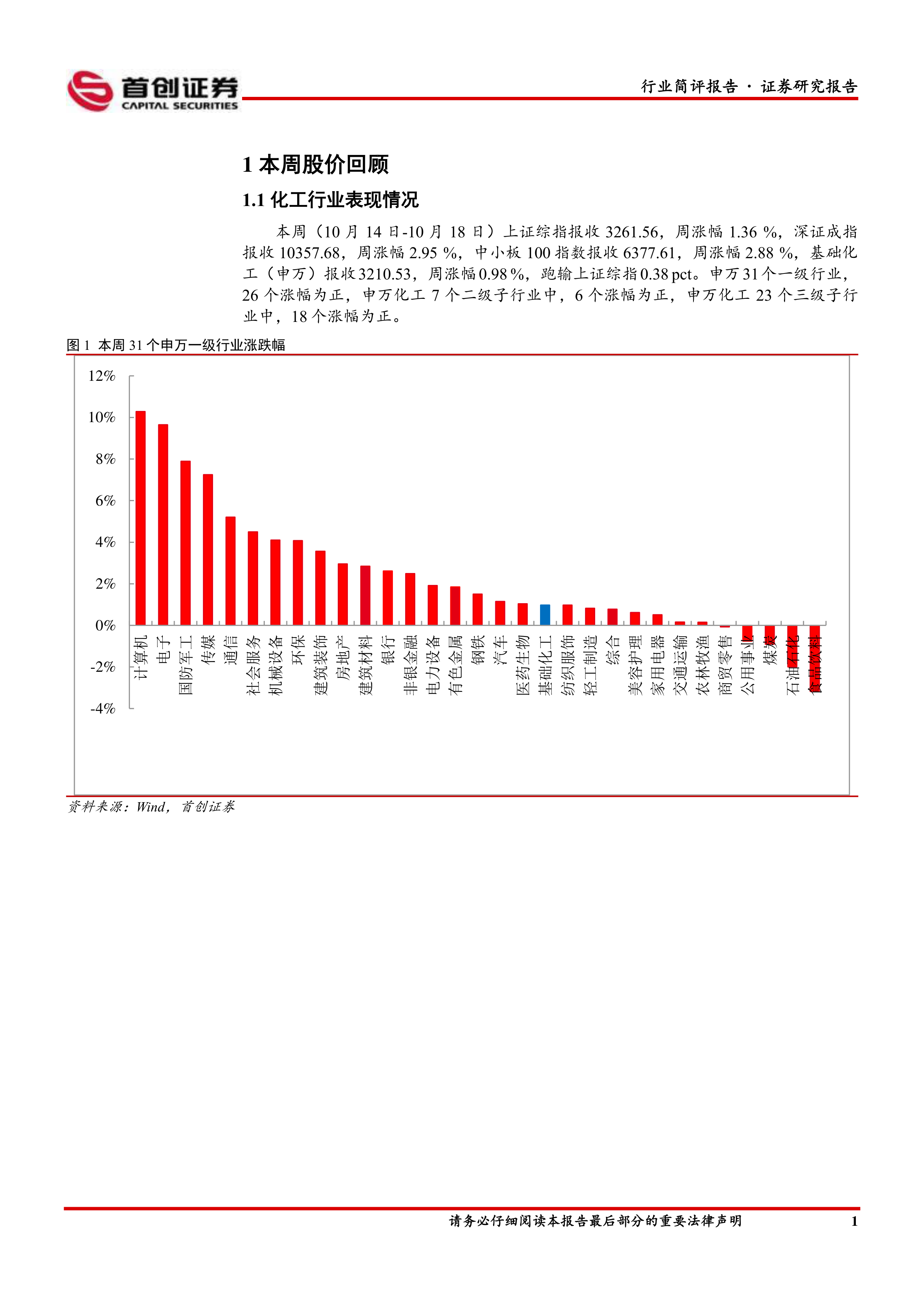 本周(10月14日-10月18日)上证综指报收3261.56,周涨幅1.36%,深证成指报收10357.68,周涨幅2.95%,中小板100指数报收6377.61,周涨幅2.88%,基础化工(申万)报收3210.53,周涨幅0.98%,跑输上证综指0.38pct。申万31个一级行业,26个涨幅为正,申万化工7个二级子行业中,6个涨幅为正,申万化工23个三级子行业中,18个涨幅为正。涨幅居前的个股有天马新材、佳先股份、科创新源、国风新材、双乐股份、恒天海龙、秉扬科技、龙高股份、汉维科技、宝丽迪。