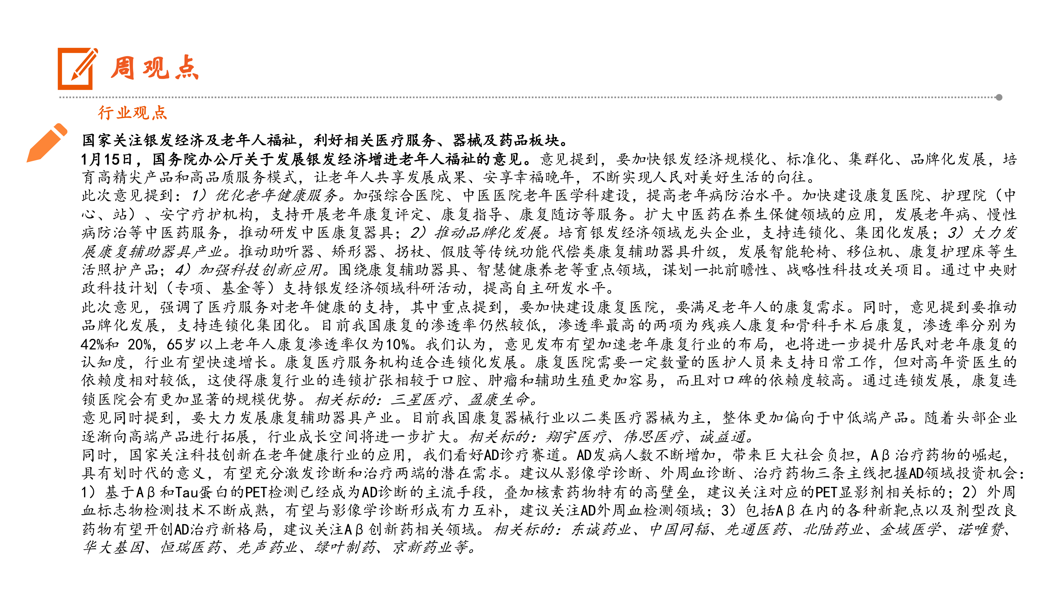 国家关注银发经济及老年人福祉,利好相关医疗服务、器械及药品板块。