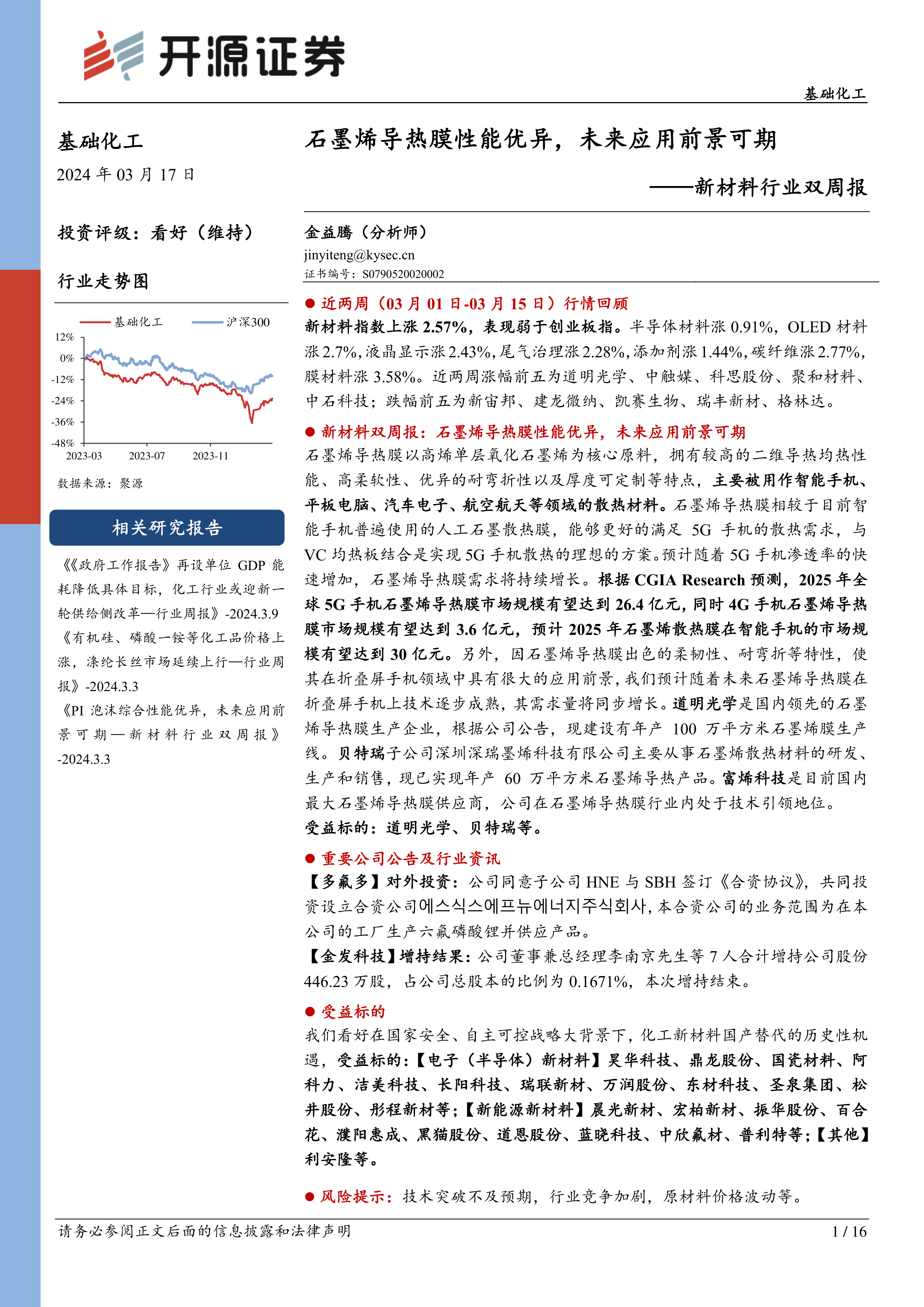 新材料行业双周报:石墨烯导热膜性能优异,未来应用前景可期