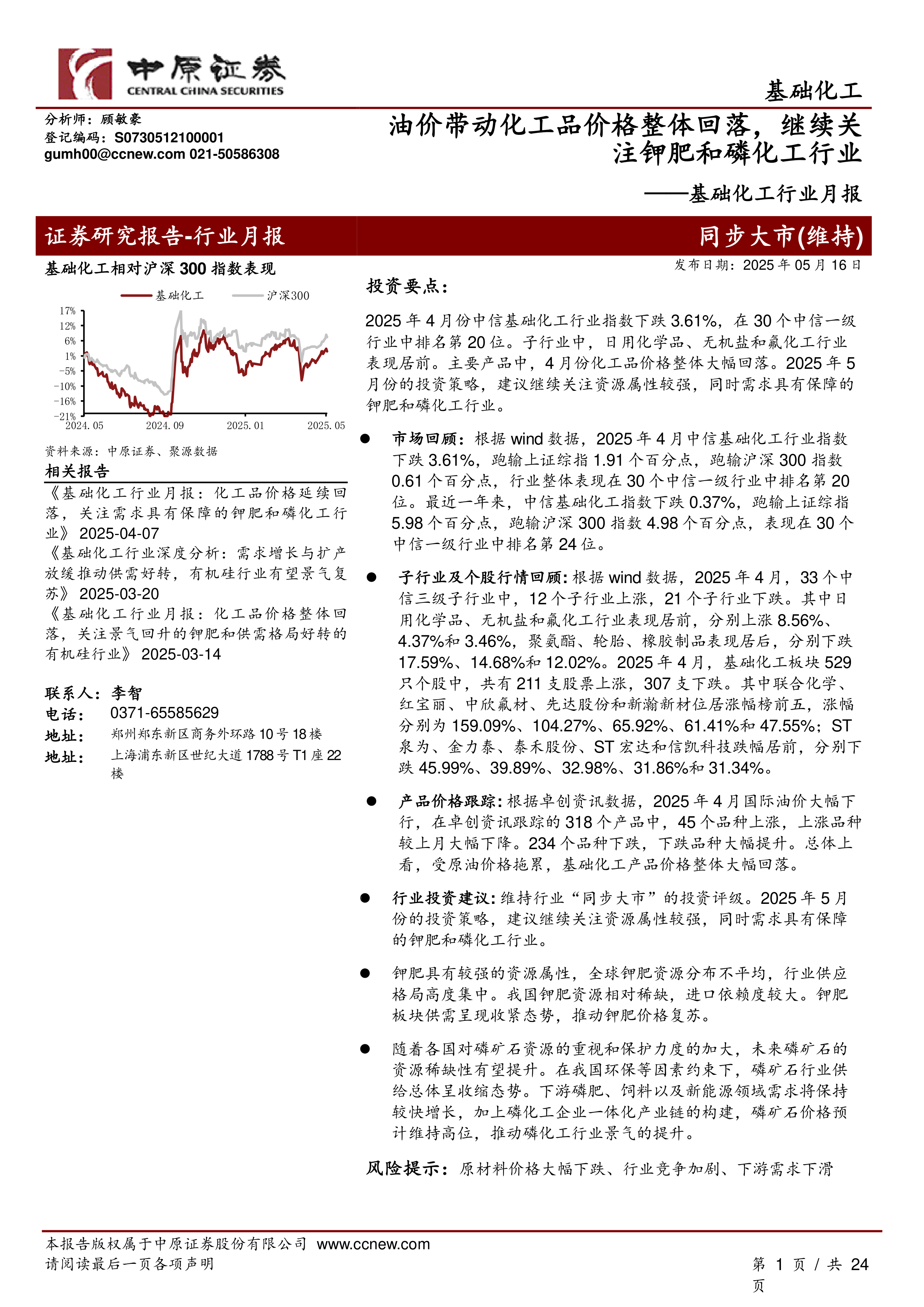 本报告基于中原证券2025年5月16日发布的《基础化工行业月报》进行分析,主要内容涵盖以下几个方面: