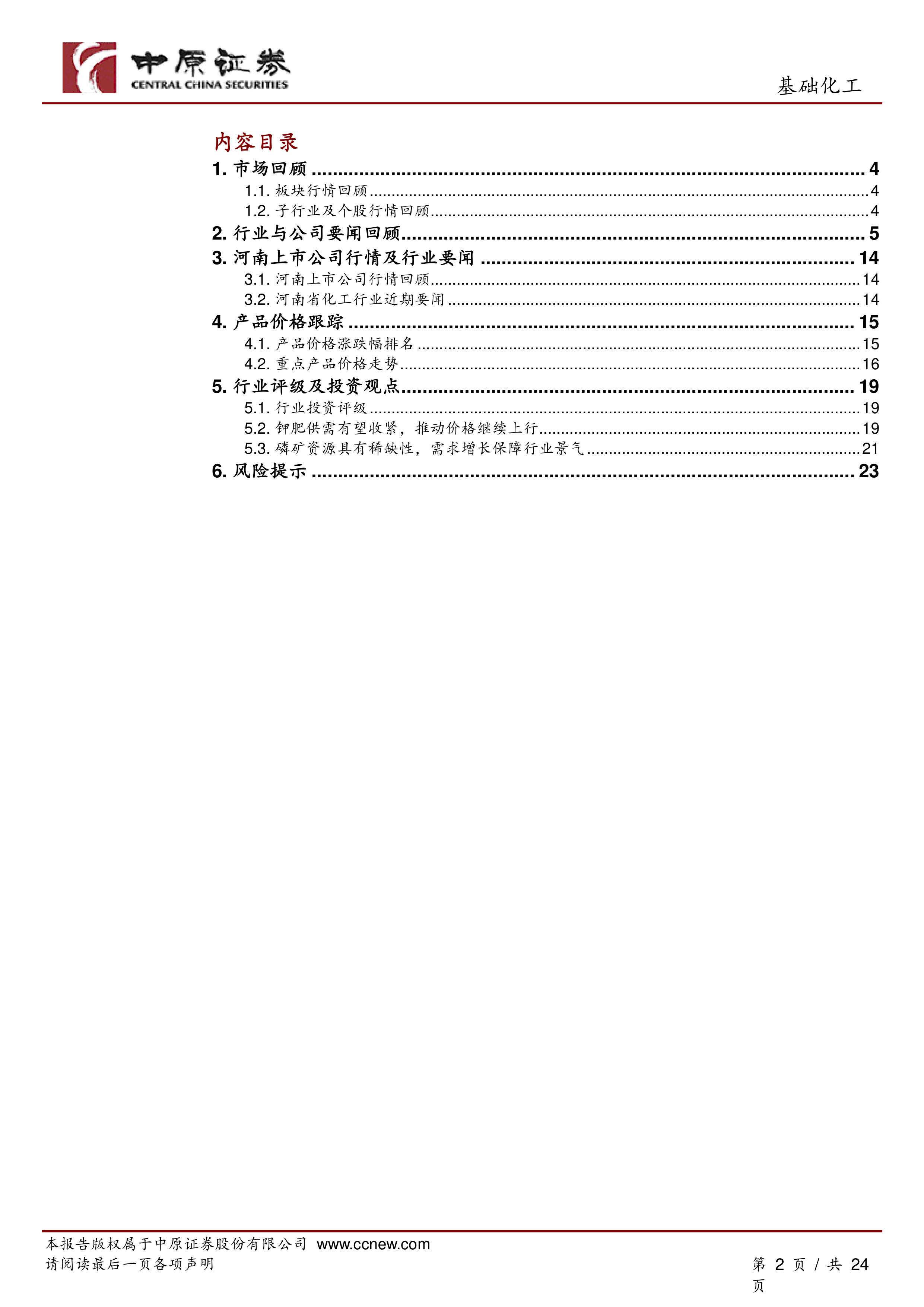 基础化工行业月报:油价带动化工品价格整体回落,继续关注钾肥和磷化工行业