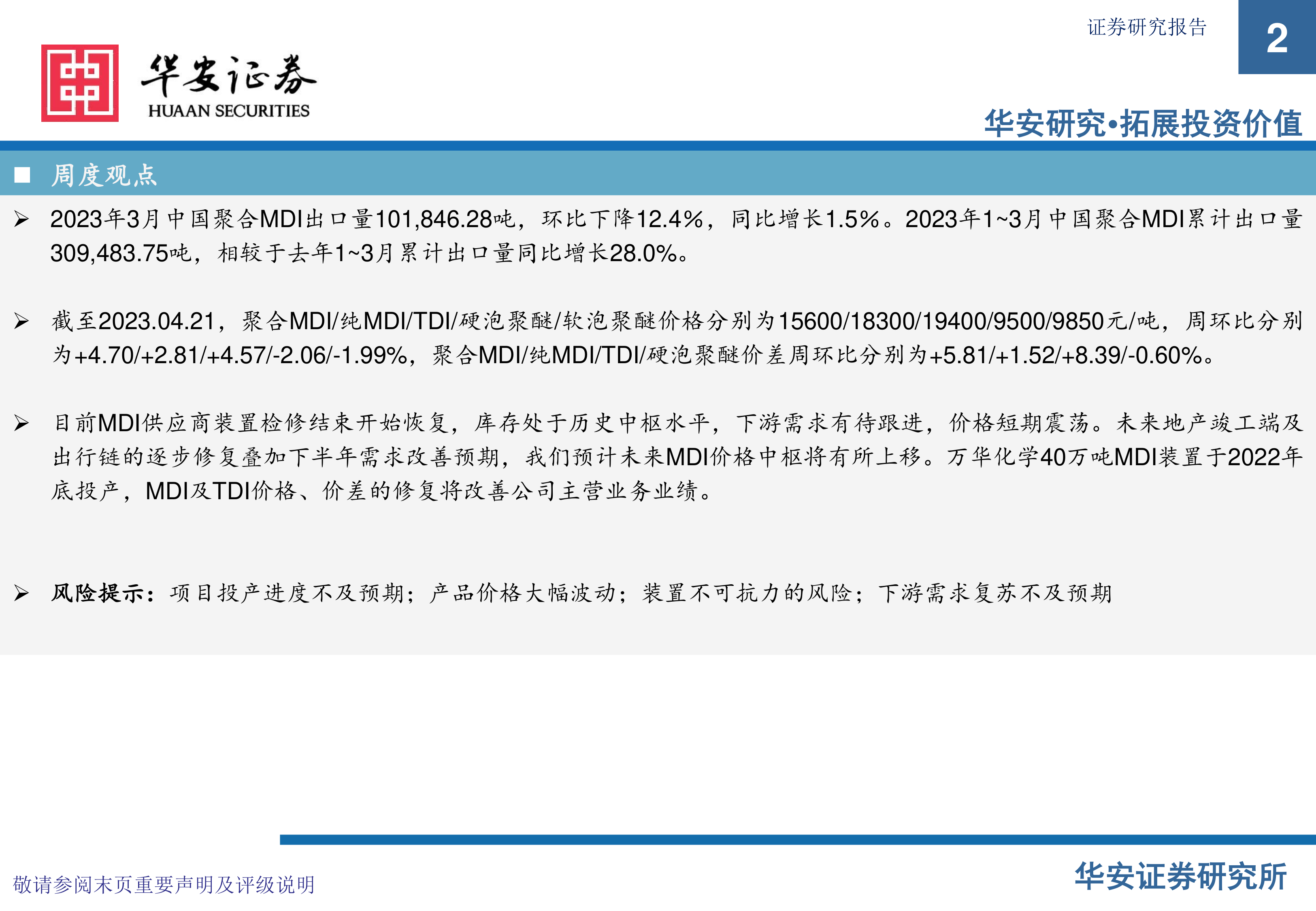 报告概述了本周(2023年4月15日至2023年4月21日)的行业和公司动态。行业动态方面,重点提及了国务院国资委将万华化学纳入创建世界一流示范企业范围,以及上海化学工业区出台的产业高质量发展专项扶持实施办法。公司动态方面,报告关注了万华化学MDI出口数据、丙烯酸及酯二期项目环评公示以及高性能新材料一体化项目进展。