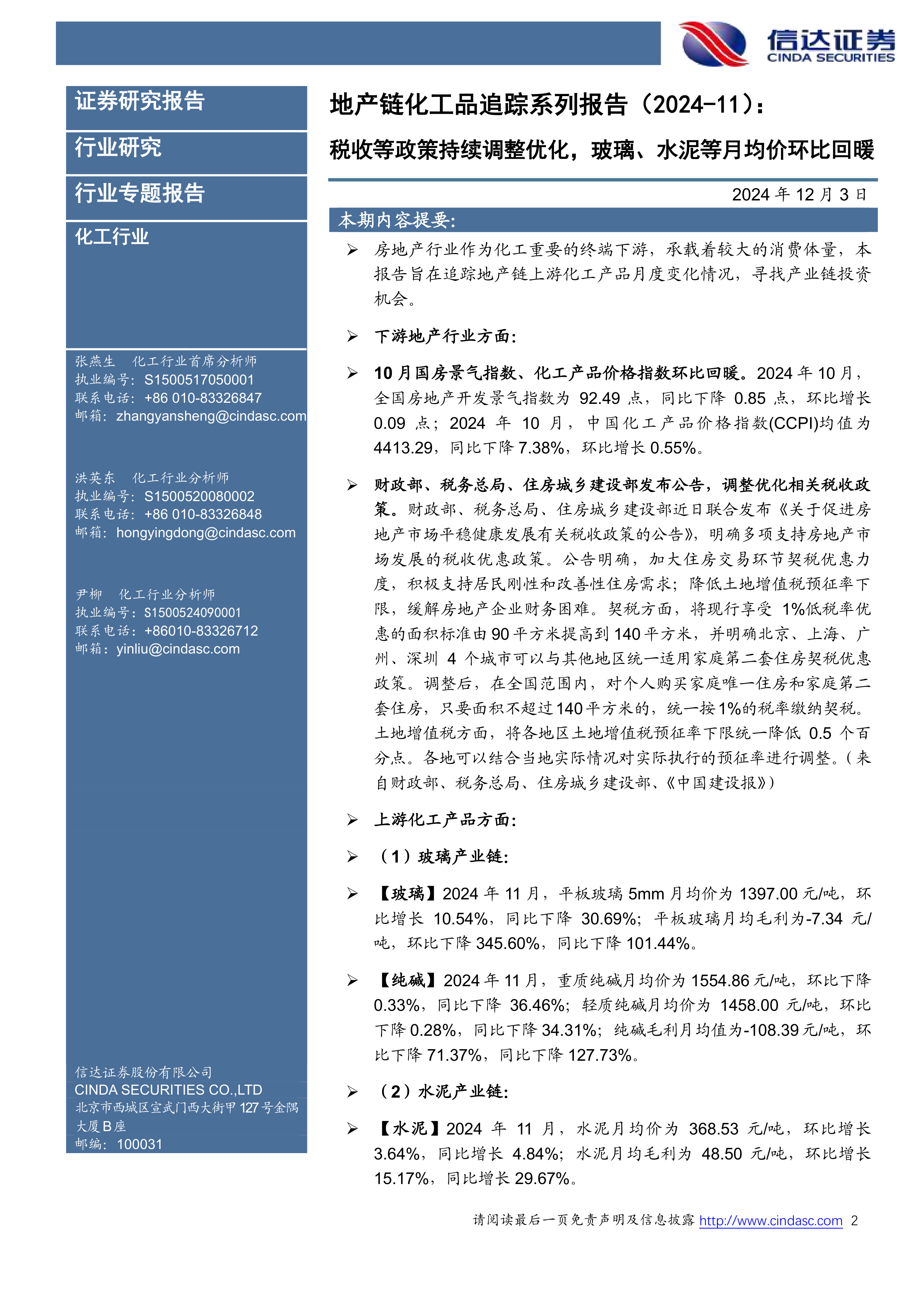 地产链化工品追踪系列报告(2024-11):税收等政策持续调整优化,玻璃、水泥等月均价环比回暖