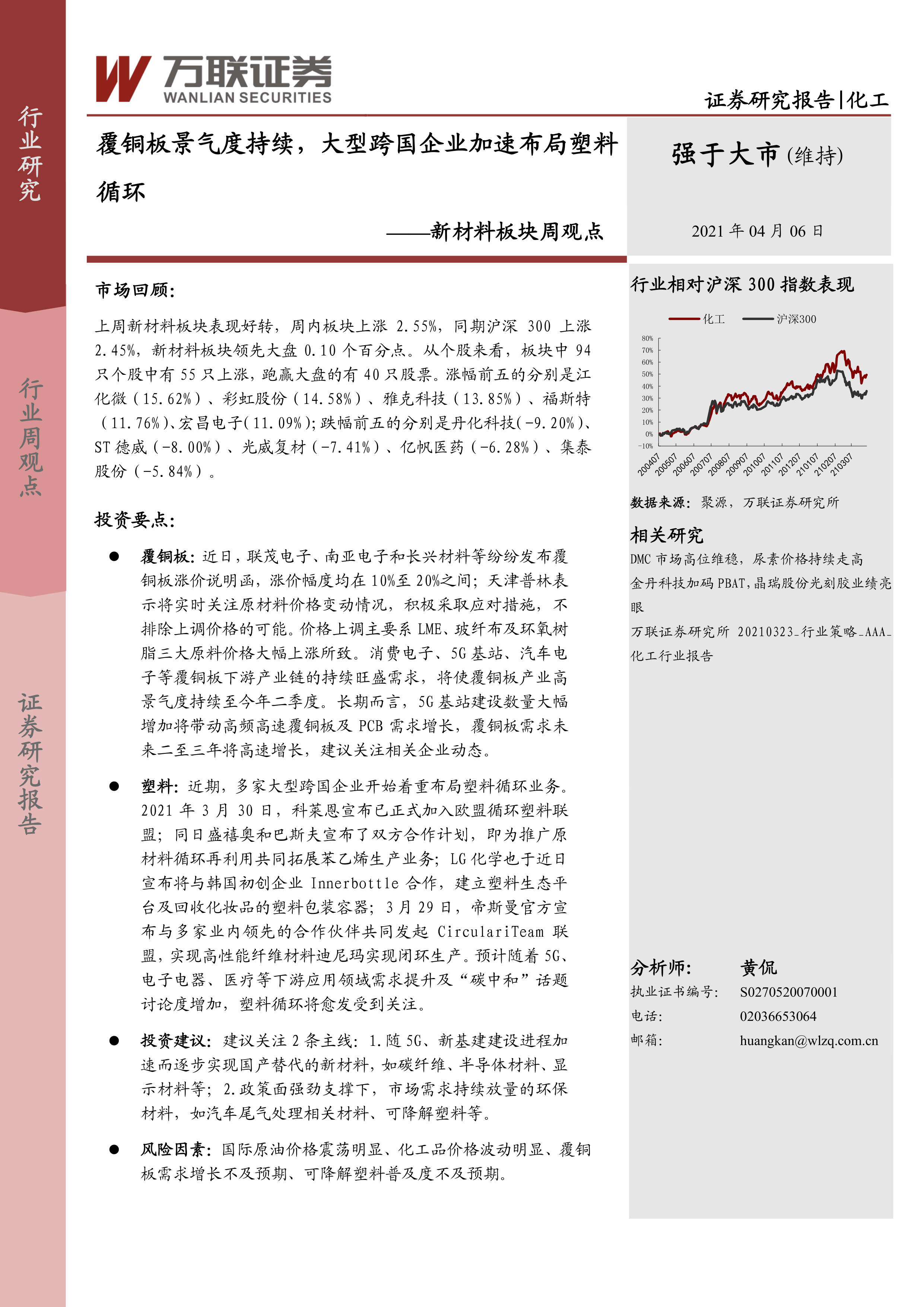 本报告的核心观点是:新材料板块上周表现强劲,跑赢大盘;覆铜板行业景气度持续高涨,多家企业宣布涨价;大型跨国企业加速布局塑料循环经济,体现了环保材料的市场潜力。 投资建议关注两条主线:一是受益于5G、新基建建设进程加速的国产替代新材料;二是政策强力支持下,市场需求持续放量的环保材料。