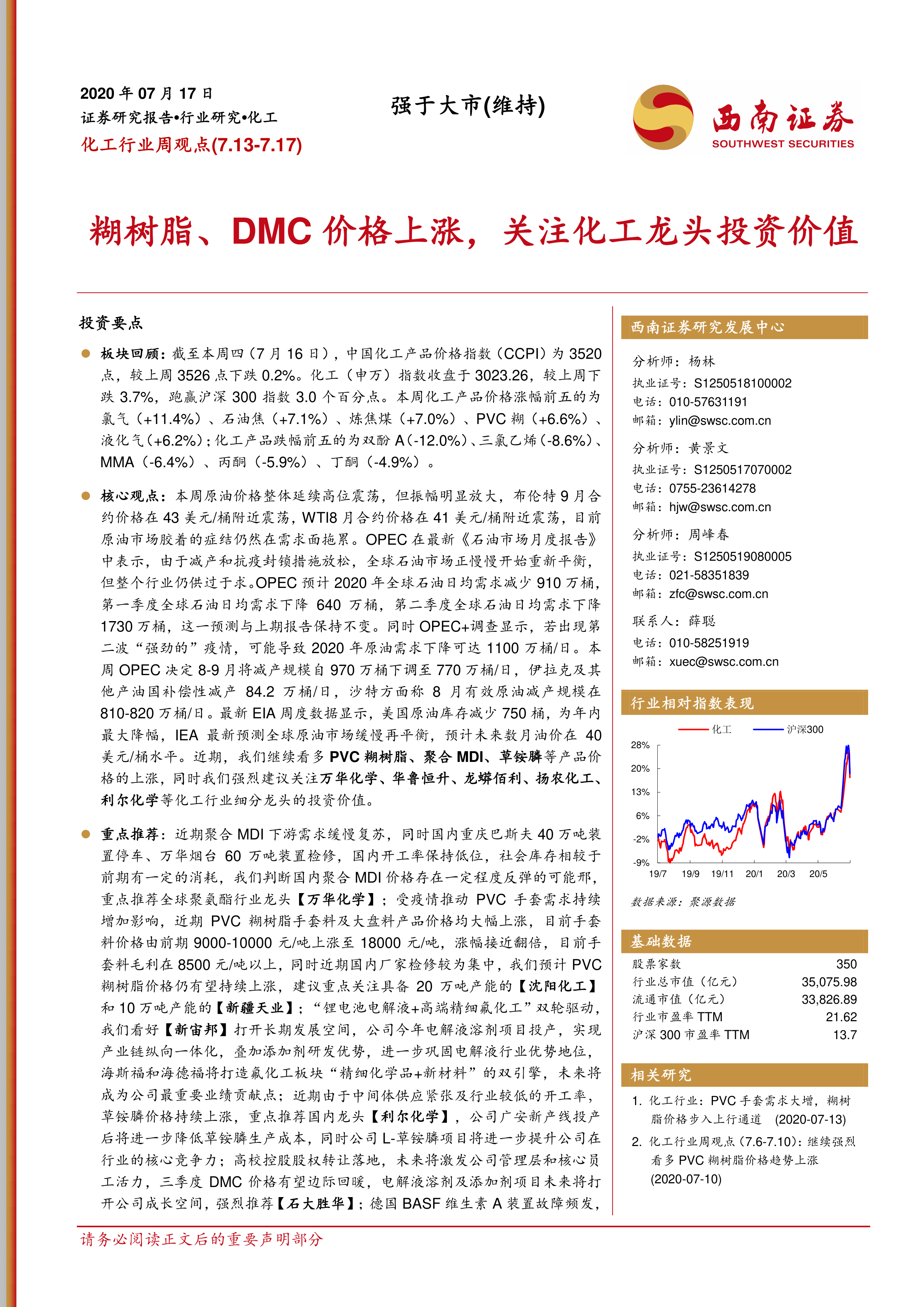 化工行业周观点:糊树脂、DMC价格上涨,关注化工龙头投资价值