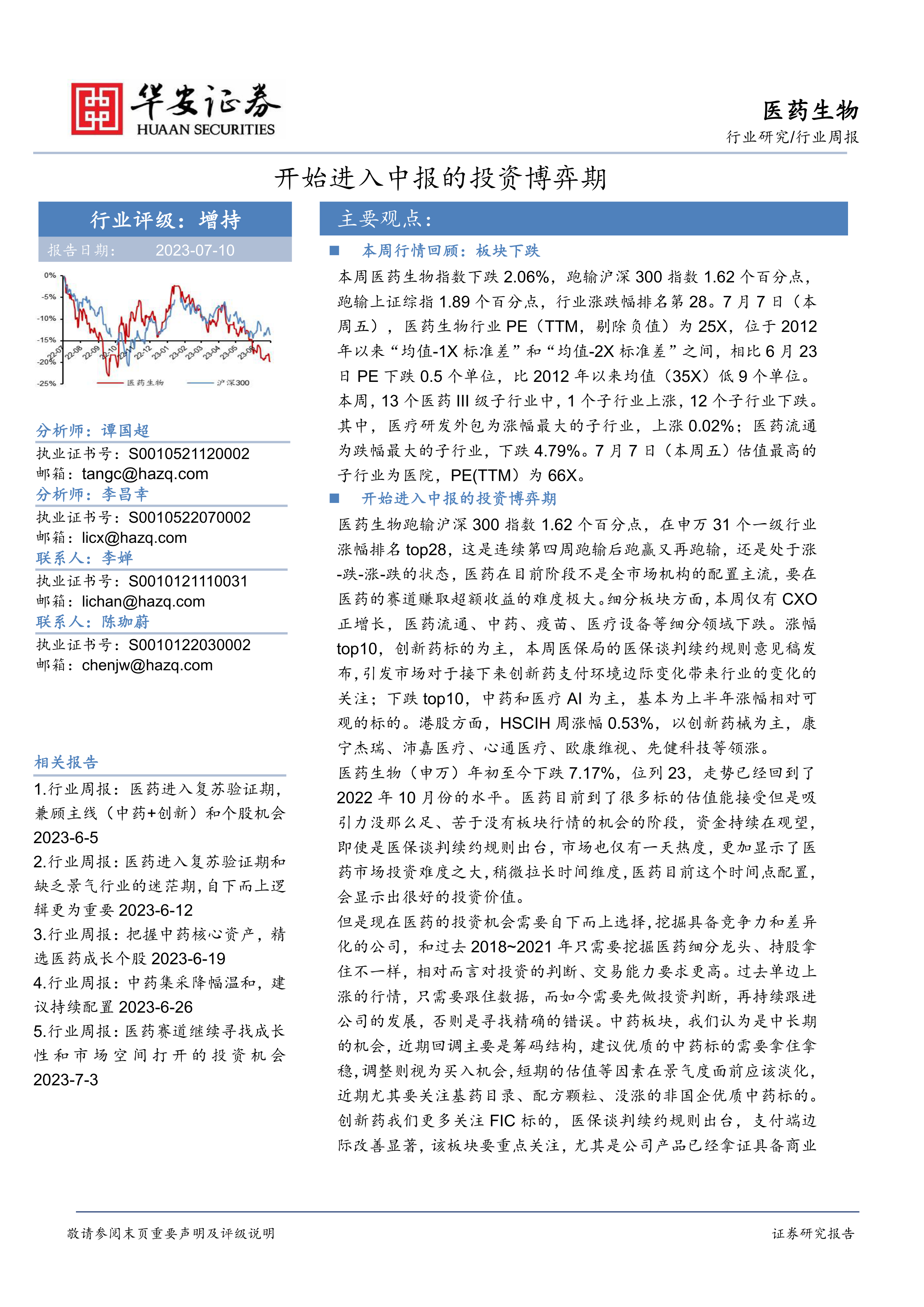 本报告的核心观点是:医药生物行业目前正处于中报投资博弈期,市场观望情绪浓厚,投资难度加大。虽然医保谈判续约规则的出台带来短期利好,但其影响有限。未来投资机会需要自下而上地选择具备竞争力和差异化优势的公司,对投资者的判断和交易能力要求更高。报告同时对部分个股进行了点评,并推荐了七月金股——健麾信息。